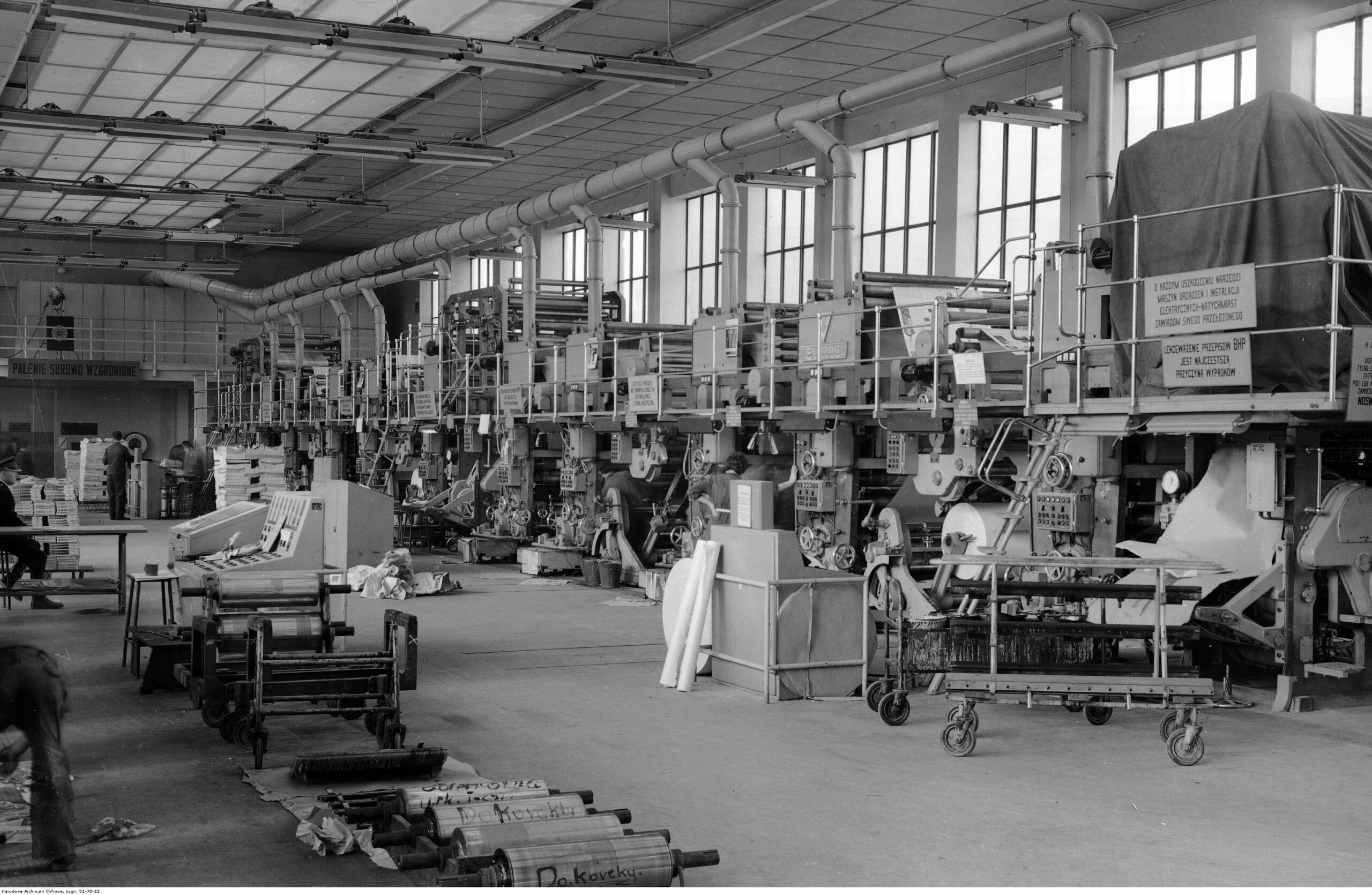 Drukarnia Robotniczej Spółdzielni Wydawniczej „Prasa”. Widok ogólny hali, 1962 r. Z połączenia „Prasy”, wydawnictwa „Książka i Wiedza” oraz Przedsiębiorstwa Upowszechniania Prasy i Książki „Ruch” w 1973 r. powstała Robotnicza Spółdzielnia Wydawnicza „Prasa-Książka-Ruch”. Fot. Narodowe Archiwum Cyfrowe Aut. Zbyszko Siemaszko