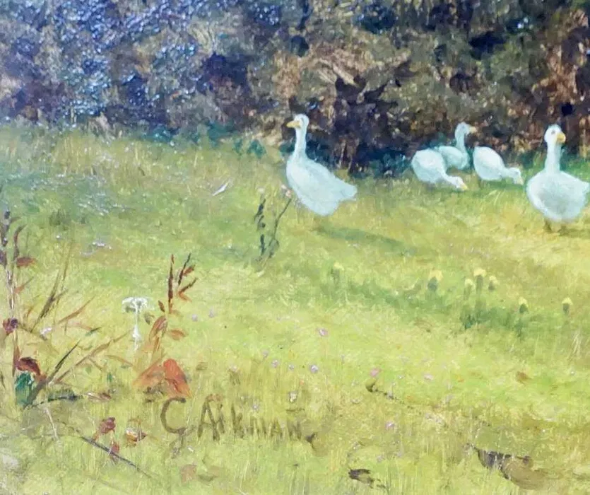Uroczy obraz olejny na płótnie, przedstawiający dziewczynkę wypasająca gąski, sygnowany w lewym dolnym rogu G. Aikmann – prawdopodobnie aut. G.[eorg] Aikmann.