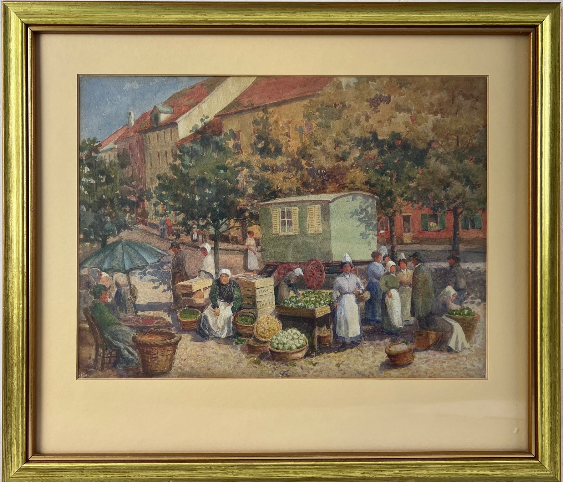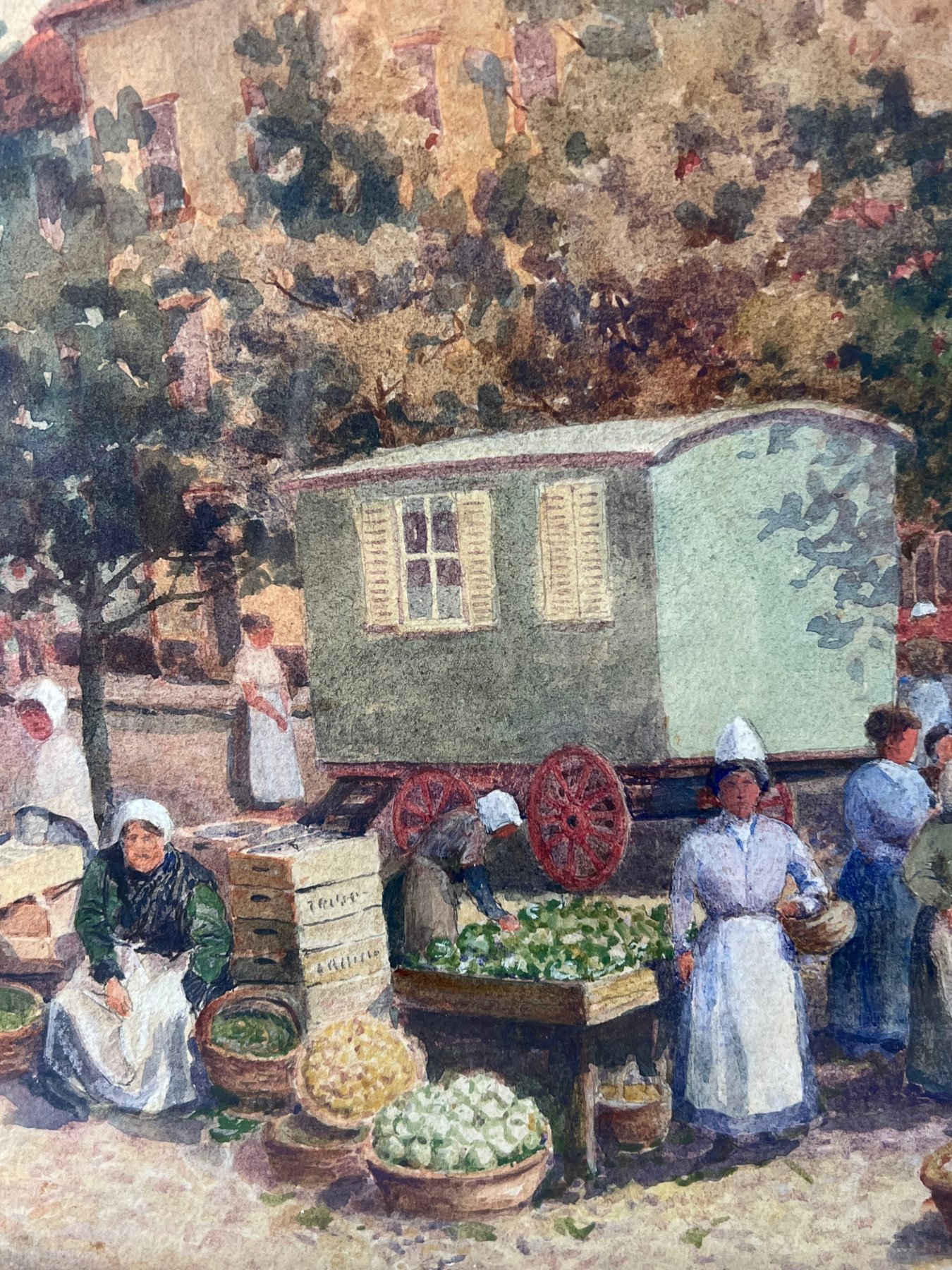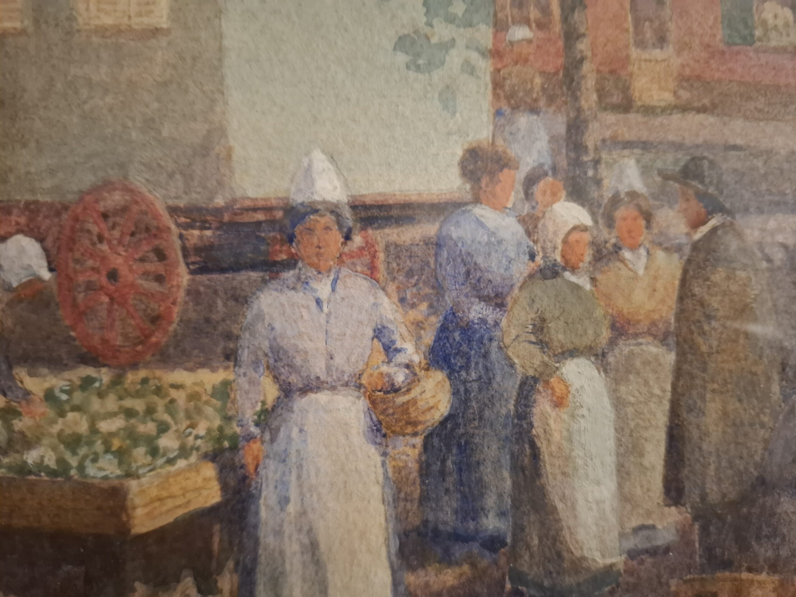Akwarela z końca XIX lub początku XX w., przedstawiająca dzień targowy w St Valery Sur Somme [Francja], autorstwa prawdopodobnie Waltera Charlesa Horsleya [1848-1921]. Na dole po lewej stronie może znajdować się niewyraźny podpis.
