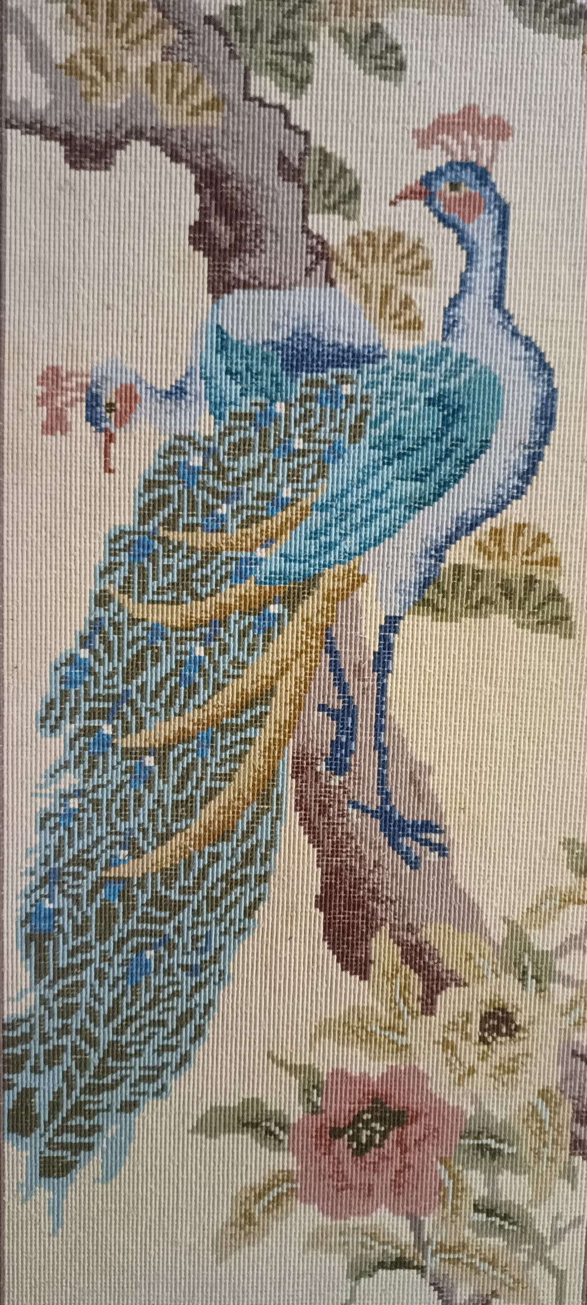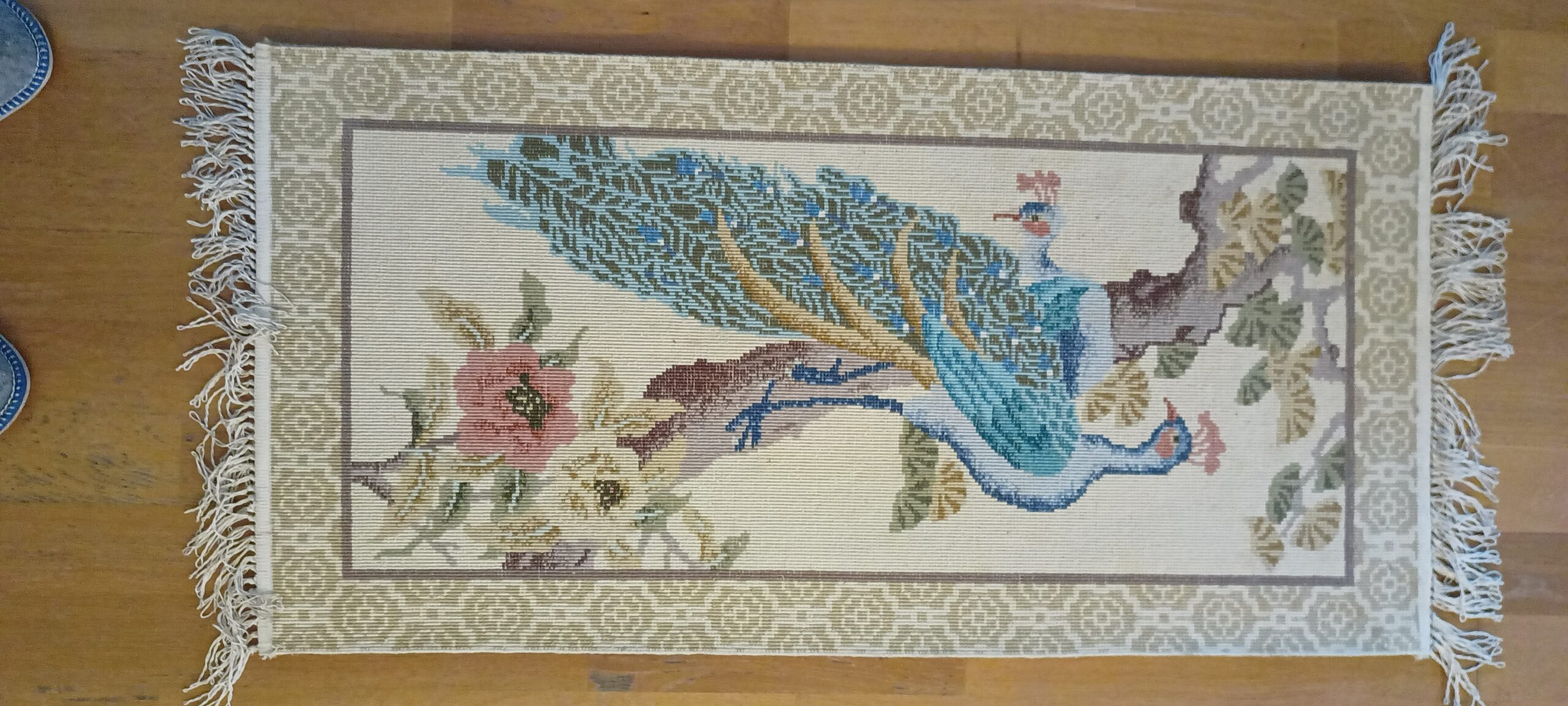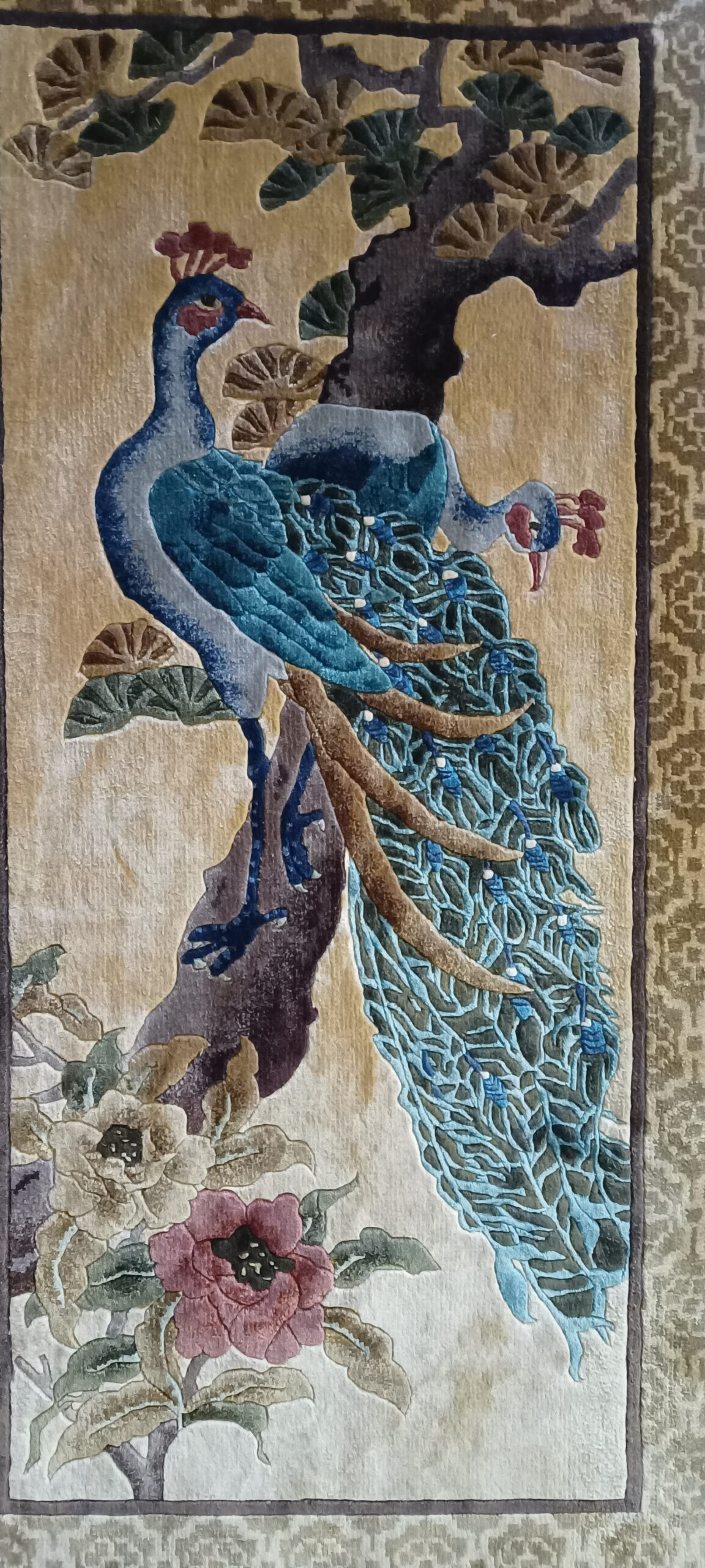 Dywan jedwab tzw. Peking na ścianę lub komodę z motywem pawi, 46×92 [plus 6 cm frędzle] – wkrótce dostępny w sprzedaży
