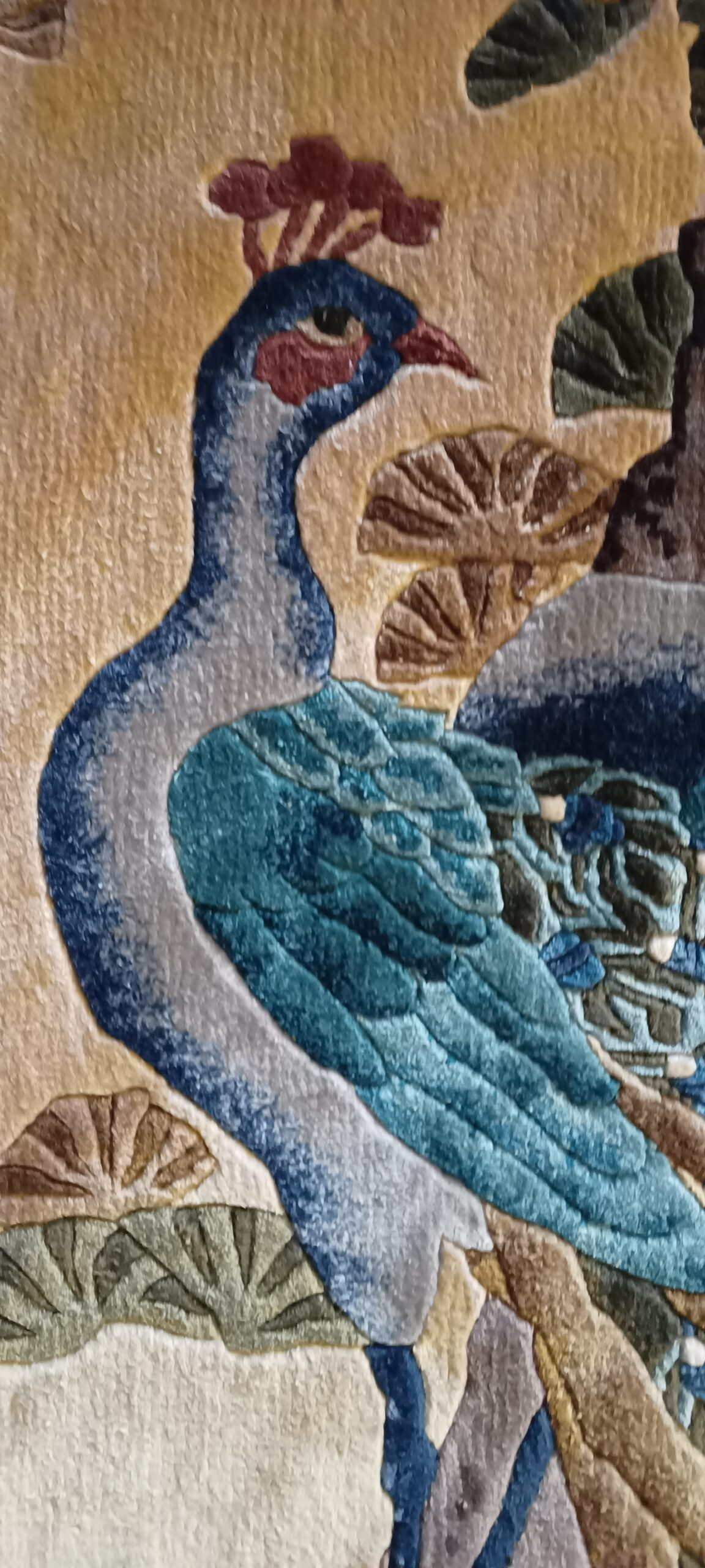 Dywan, dywanik retro, vitage, tzw. Peking, wykonany z jedwabiu. Wymiary 46×92 plus frędzle 6 cm, ręcznie tkany w Chinach, prawdopodobnie lata 60. Kolekcjonerski, vintage, retro, z motywem dwóch pawi. W dotyku efekt płaskorzeźby – kształty wyczuwalne pod palcami.