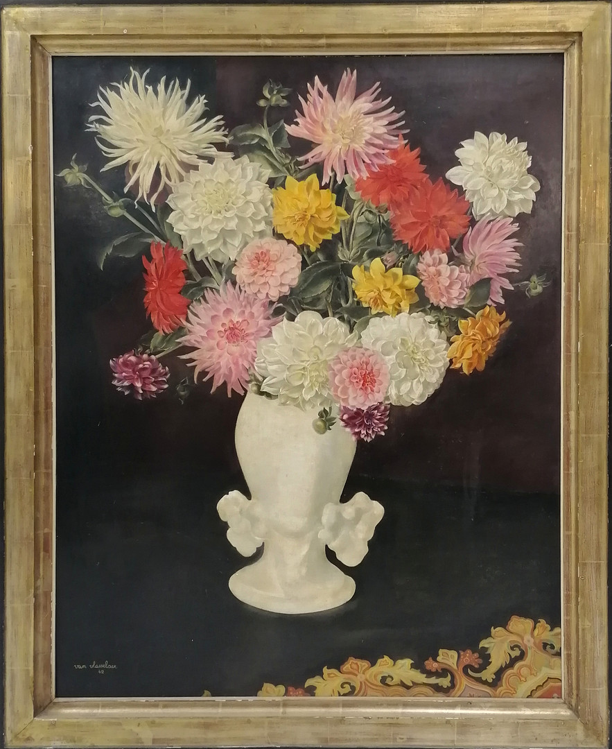 Julien van Vlasselaer [1907-82], „Kwiaty w wazonie”, 110x90cm [rama], sygnowany l/d van Vlasselaer 42; wkrótce dostępny w sprzedaży