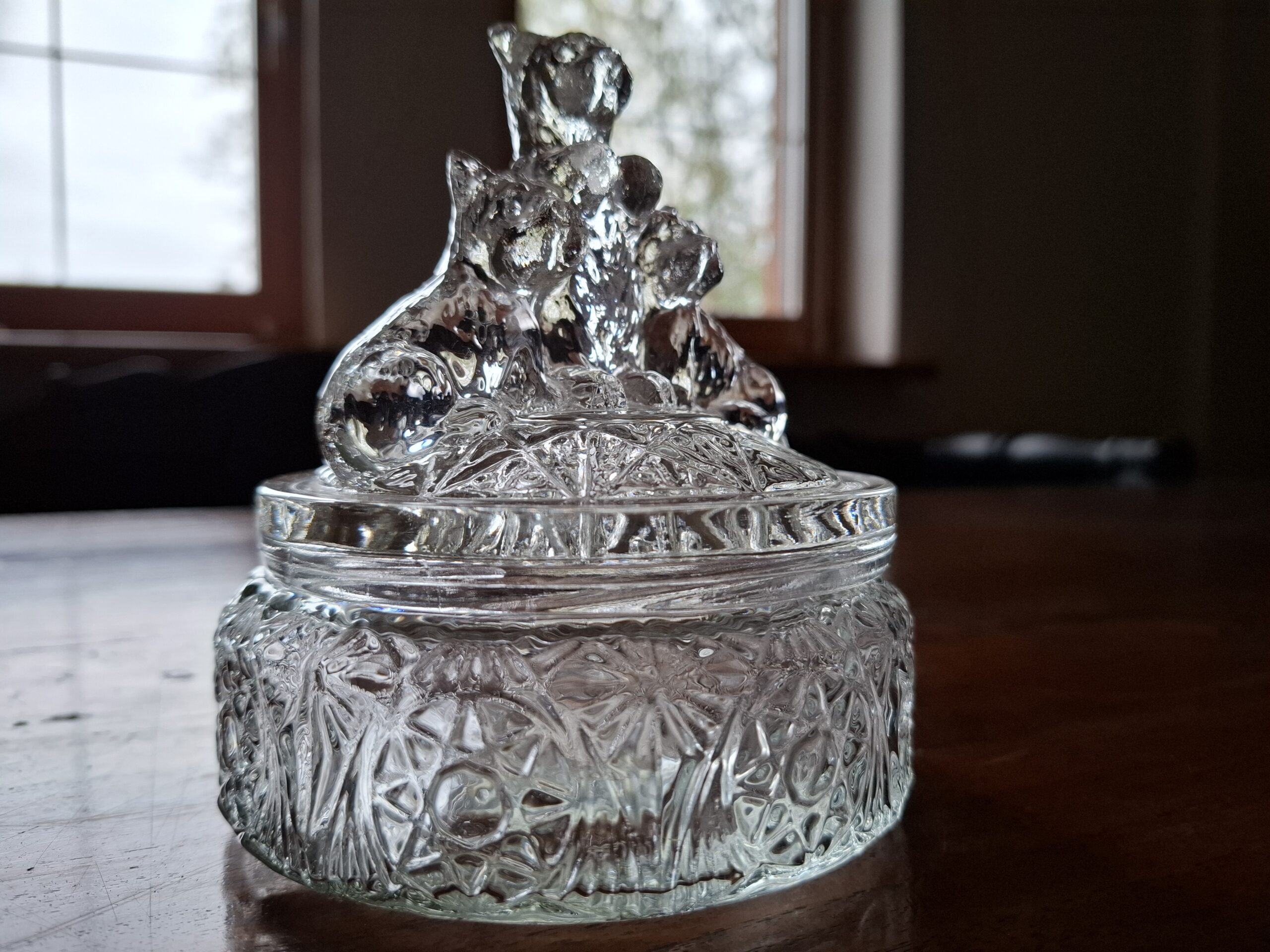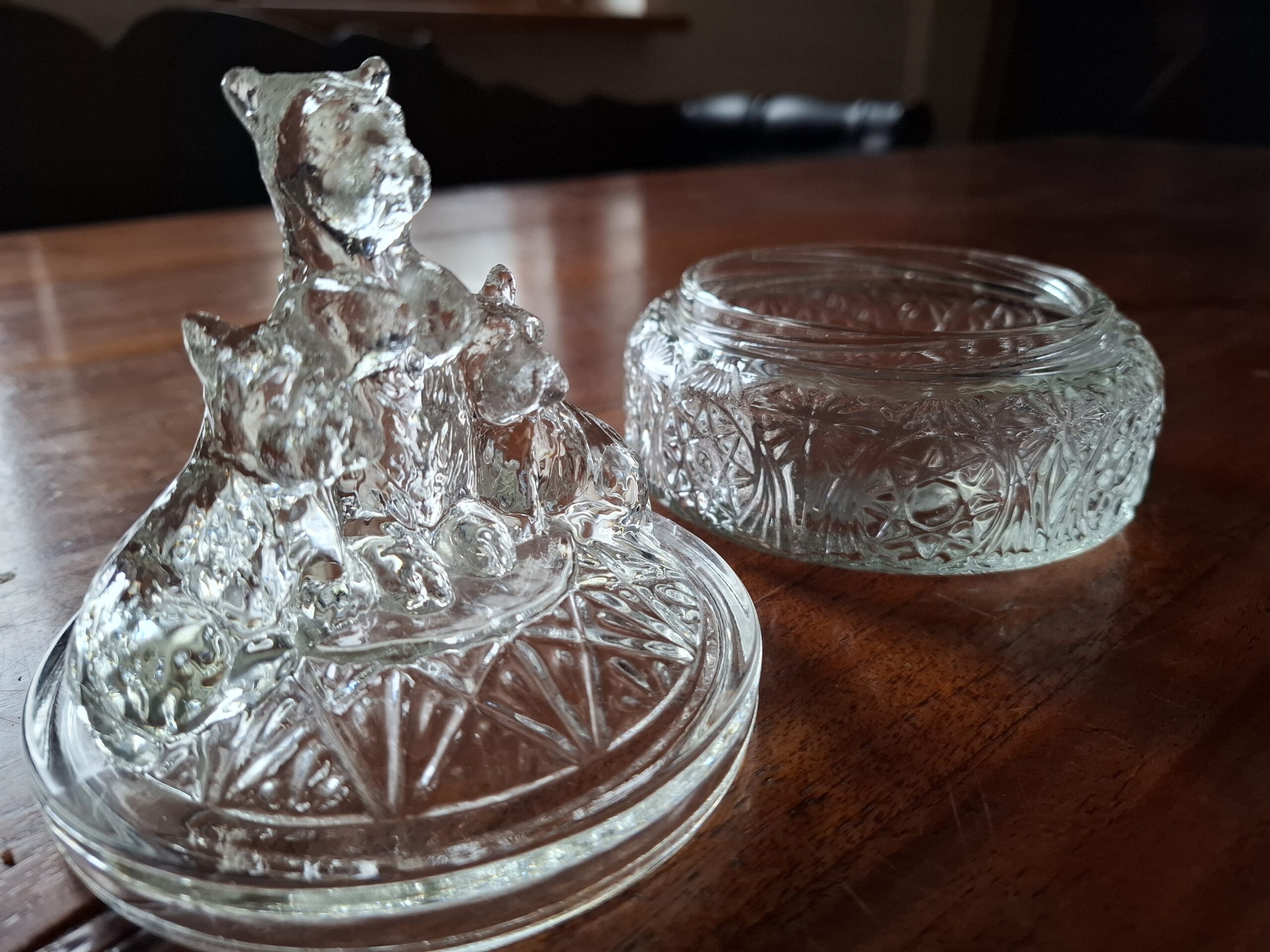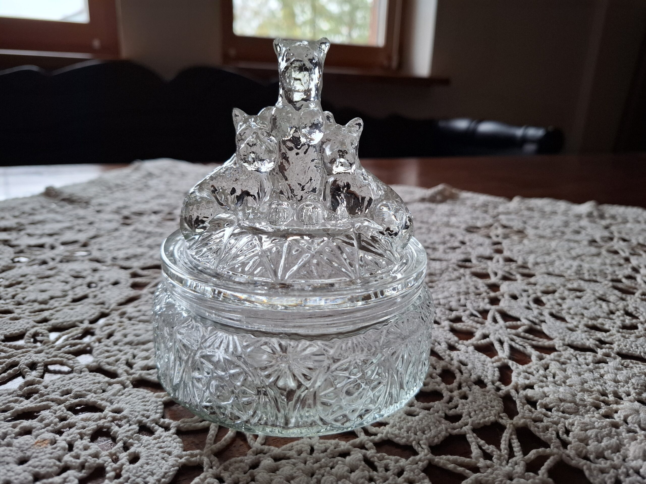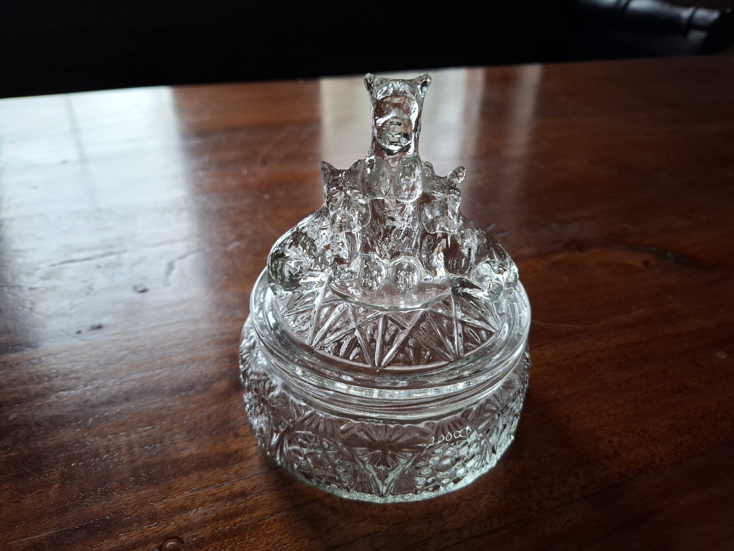 L.E. Smith kryształowe pudełko z pieskami, lata 30-te XX w., art deco, Great Depression Era glass – wkrótce dostępny w sprzedaży