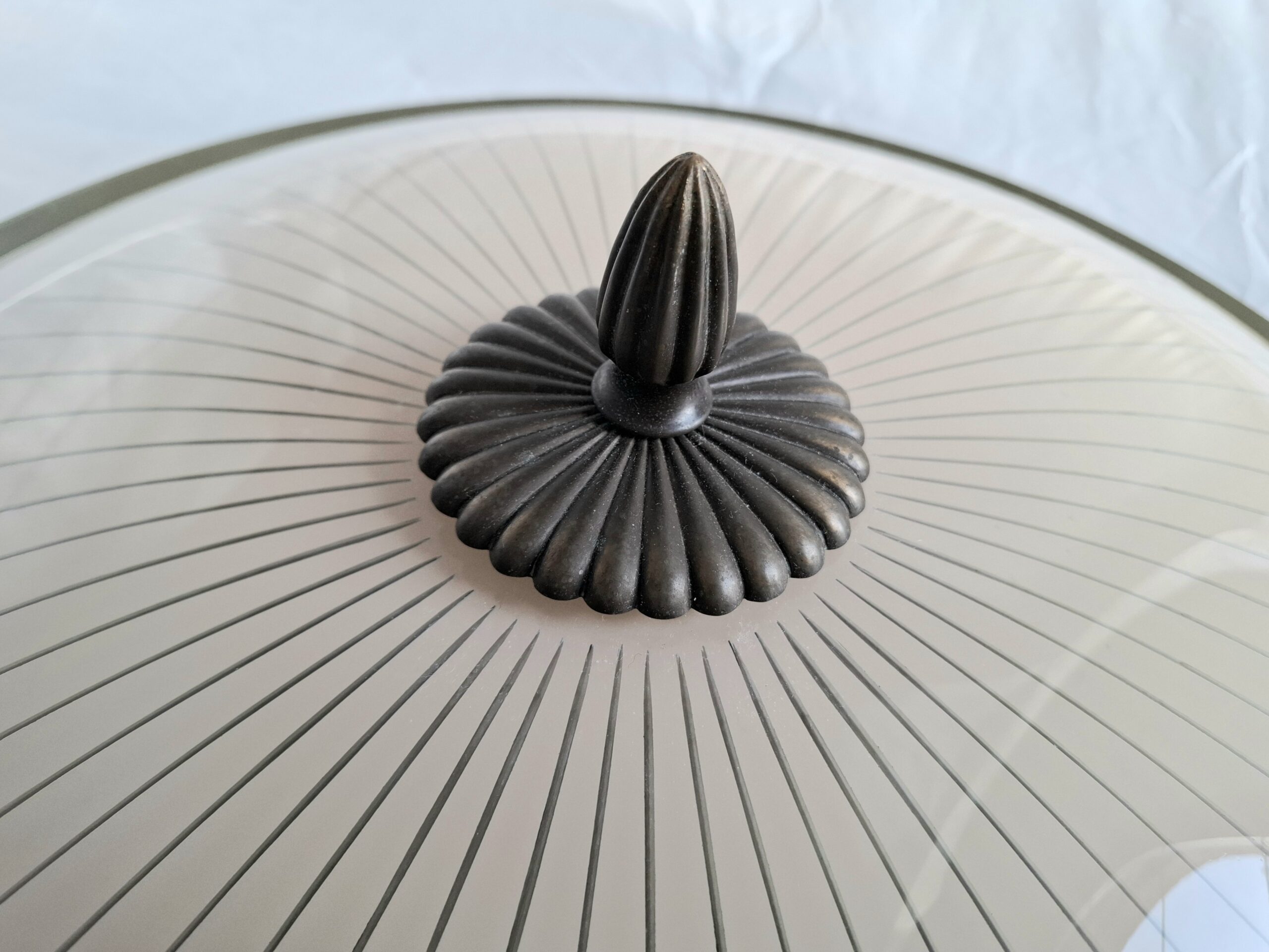 Szklany klosz w kolorze kości słoniowej z promienistym wzorem. Lampa posiada gwinty na dwie żarówki. Lampa bez widocznych uszkodzeń, jakkolwiek okablowanie jest oryginale i może wymagać wymiany.