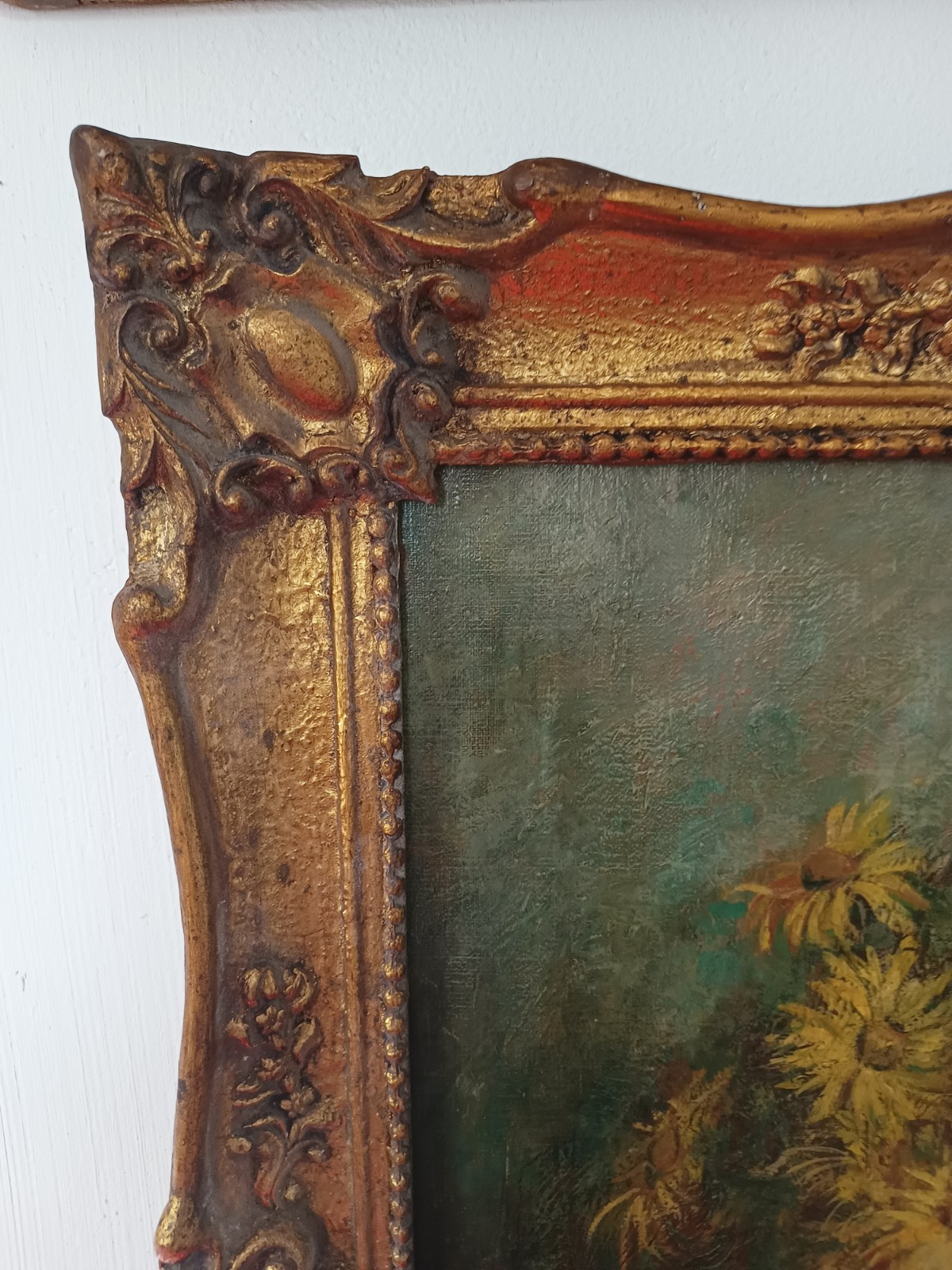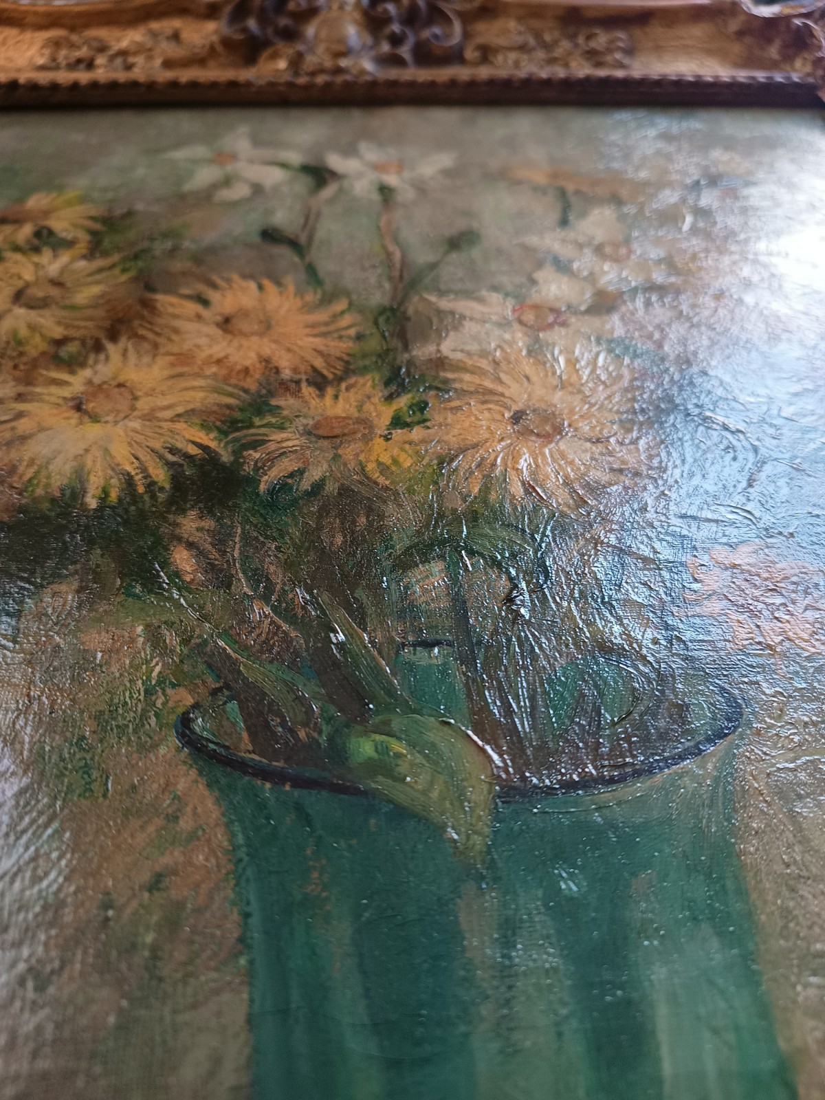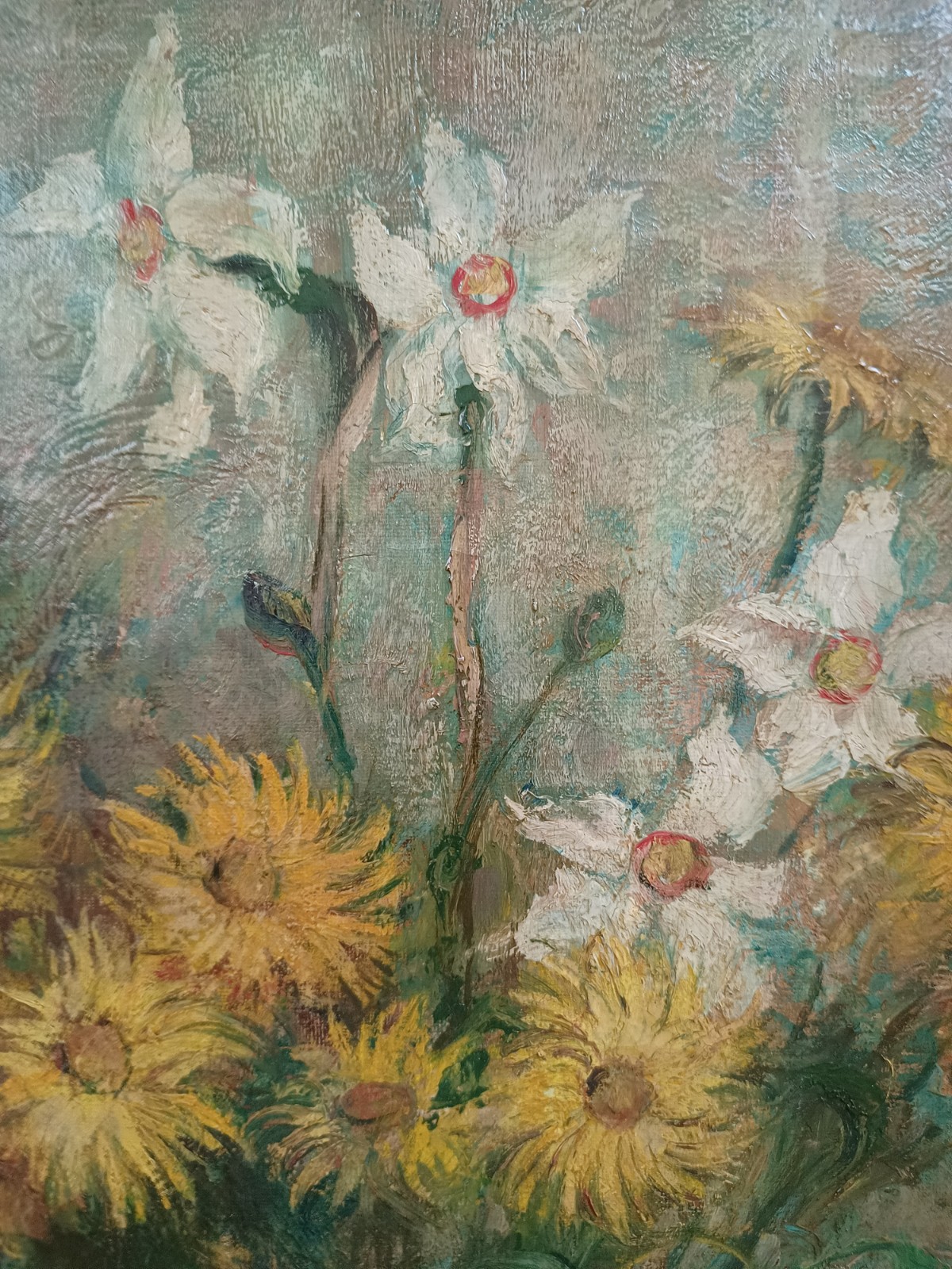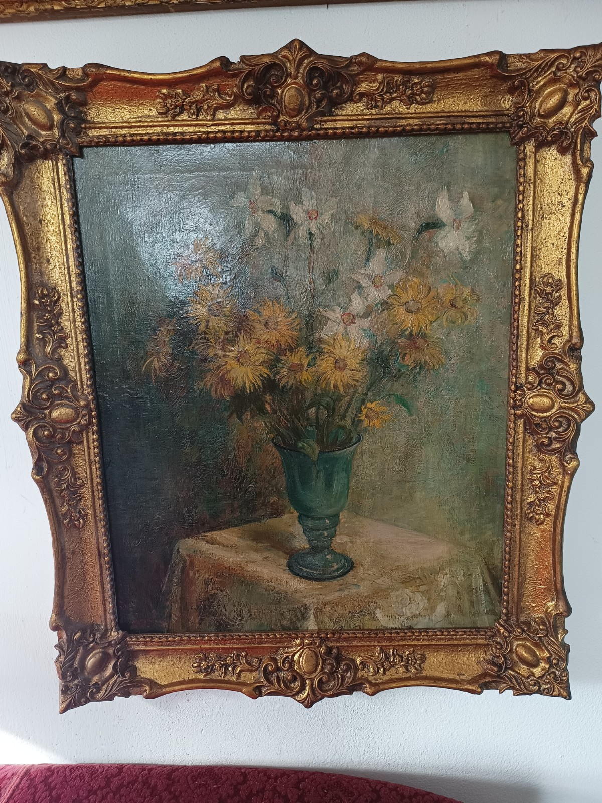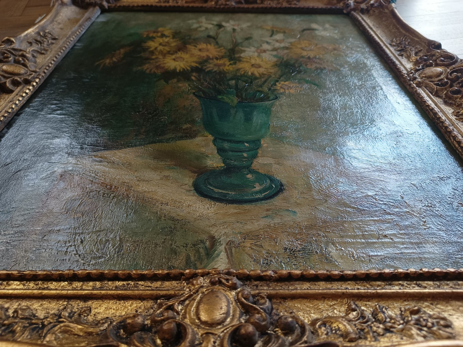 Stary obraz przedstawiający wiosenne kwiaty w szklanym wazonie, w złoconej drewnianej ramie. Stonowane kolory wiosennych żonkili i nachyłka wielokwiatowego (a może słoneczniczka szorstkiego) wyglądają pięknie w każdym świetle.