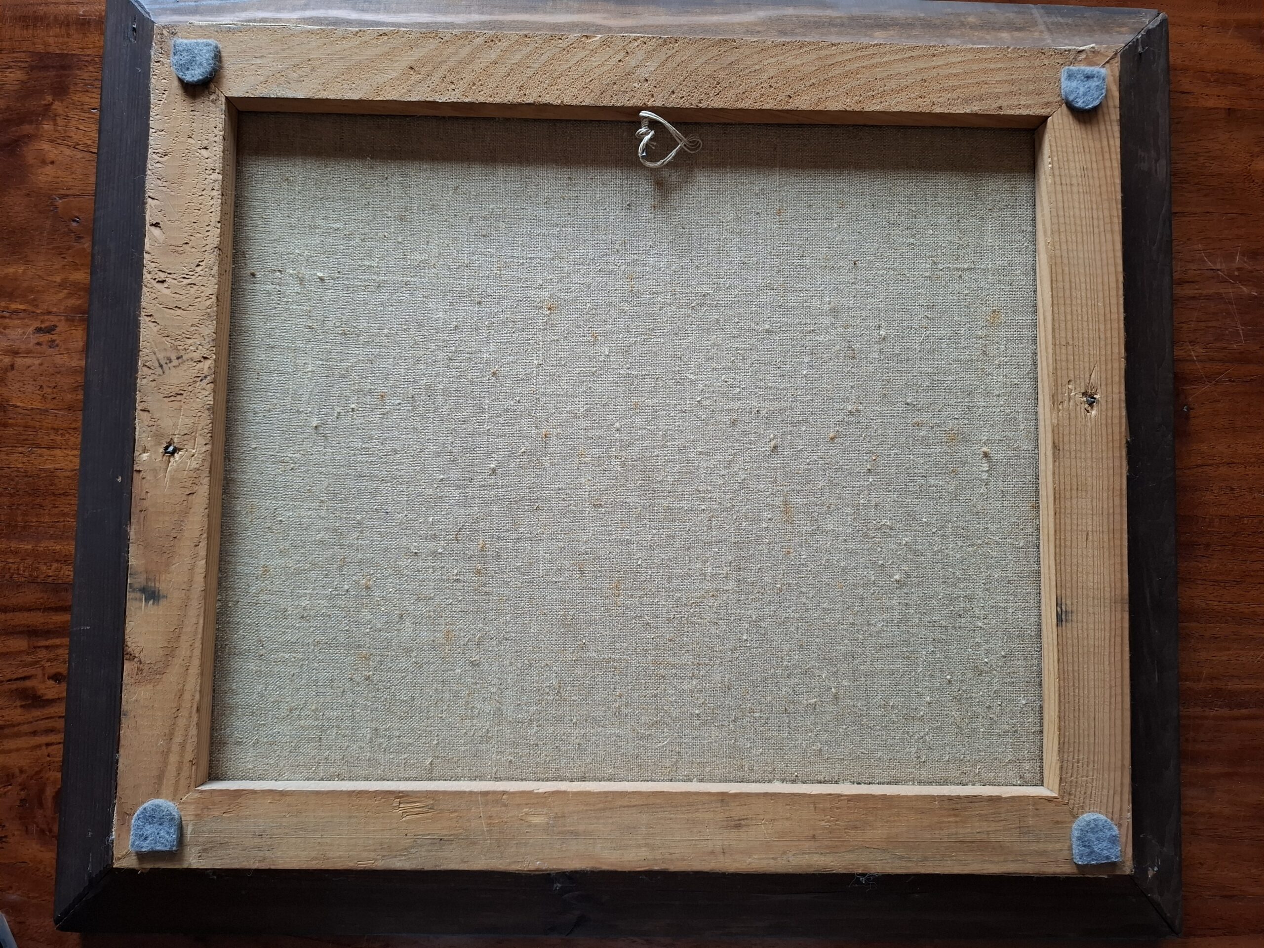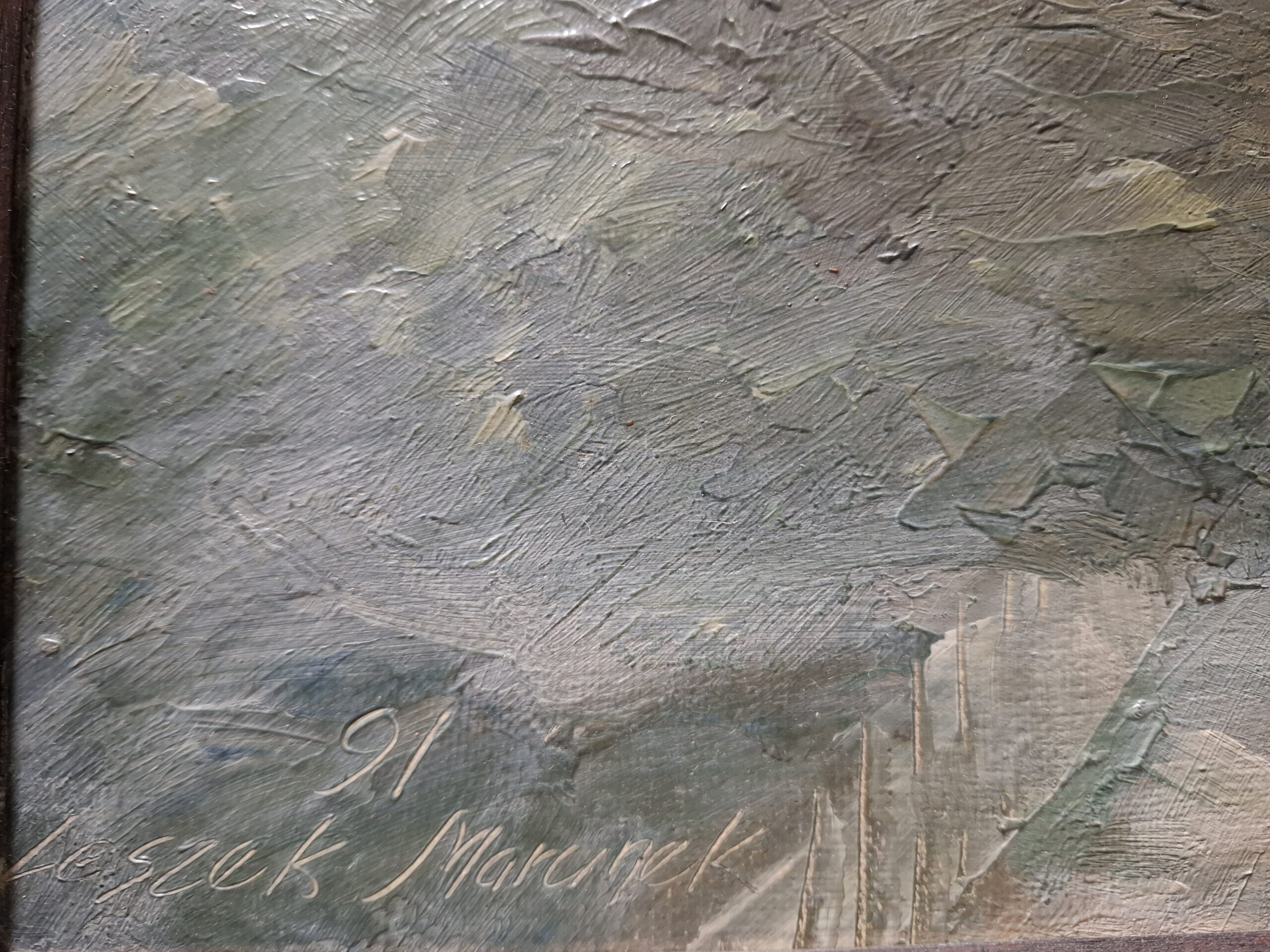 Obraz olejny na płótnie 59×51 [rama] 49 x41 [płótno] polskiego malarza Leszka [nieczytelne nazwisko], sygnowany lewy dolny