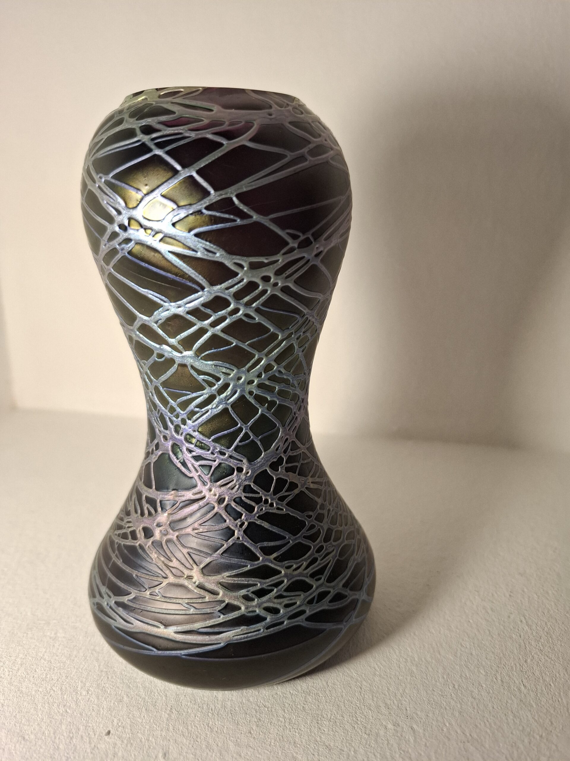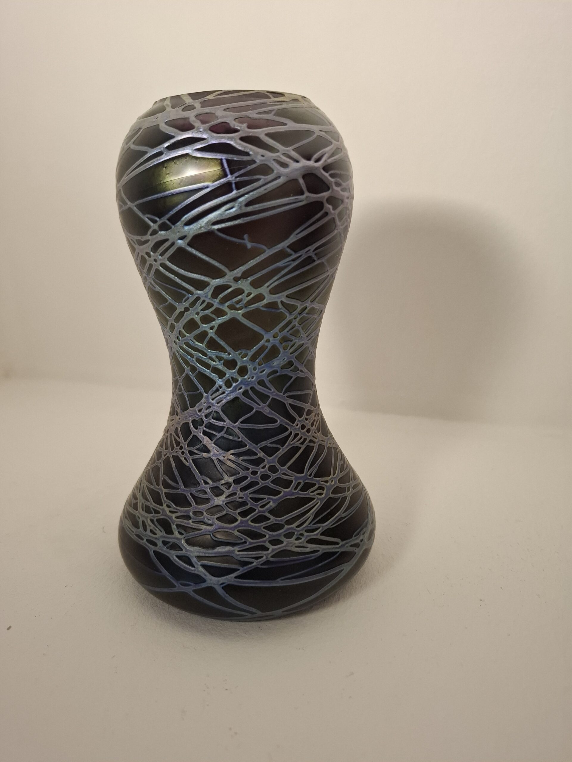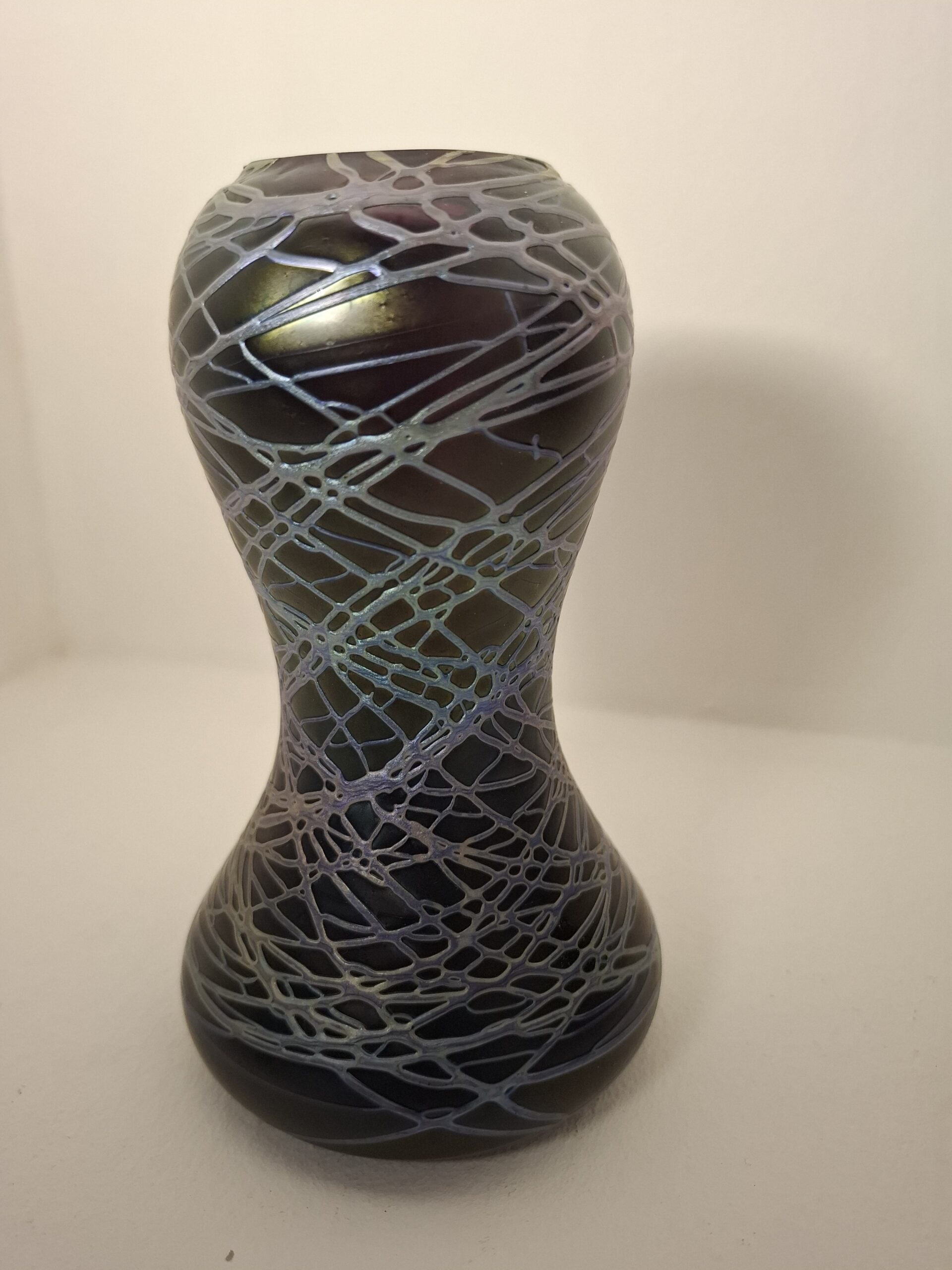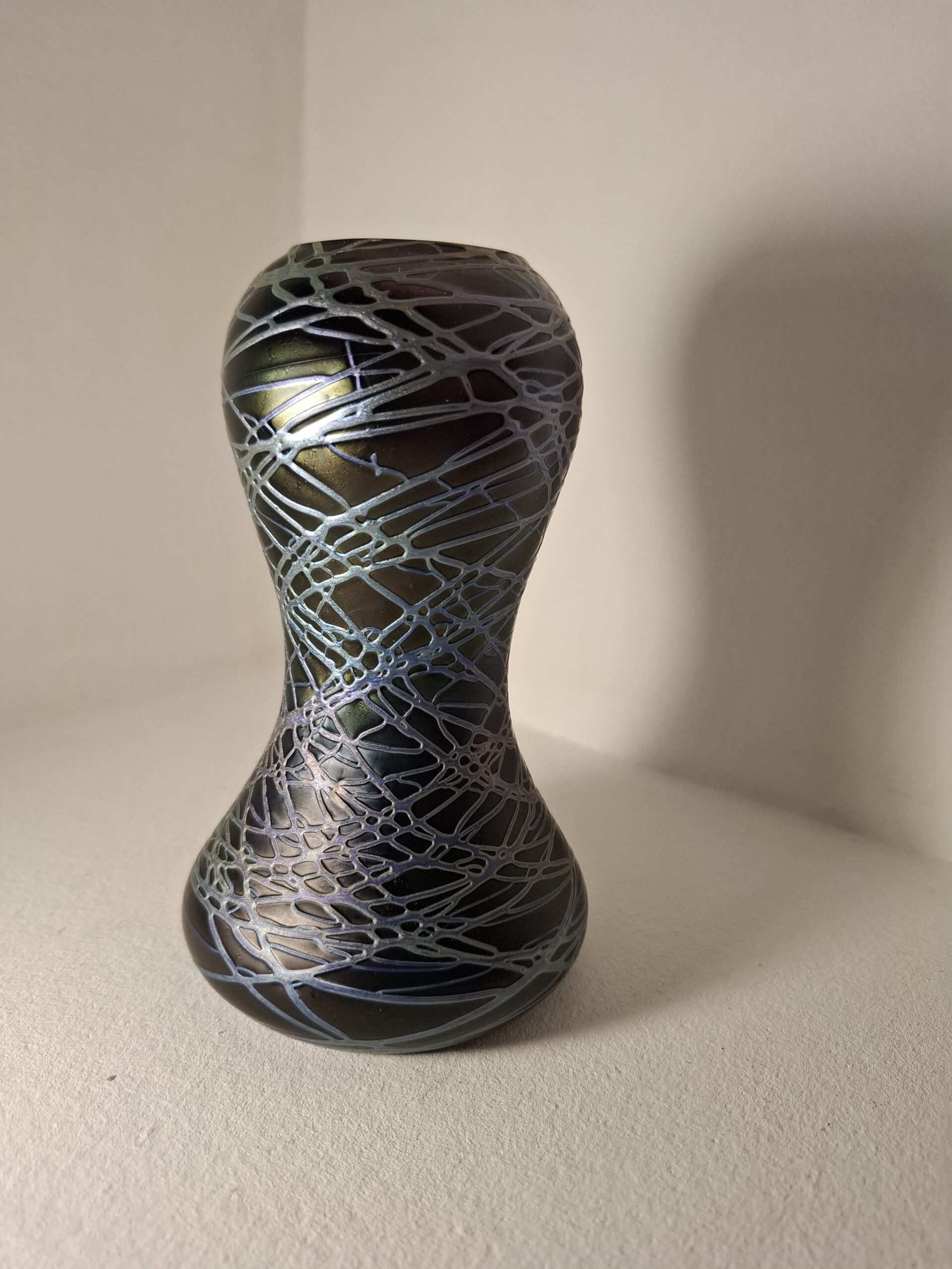 Opalizujący wazon austro-wegierskiego producenta Loetz, wzbogacony cieniowanymi, niebieskawymi liniami. Prawdopodobnie pochodzi z końca XIX w. Wysokość 15 cm, szerokość max 10 cm. U podstawy sygnatura Loetz.
