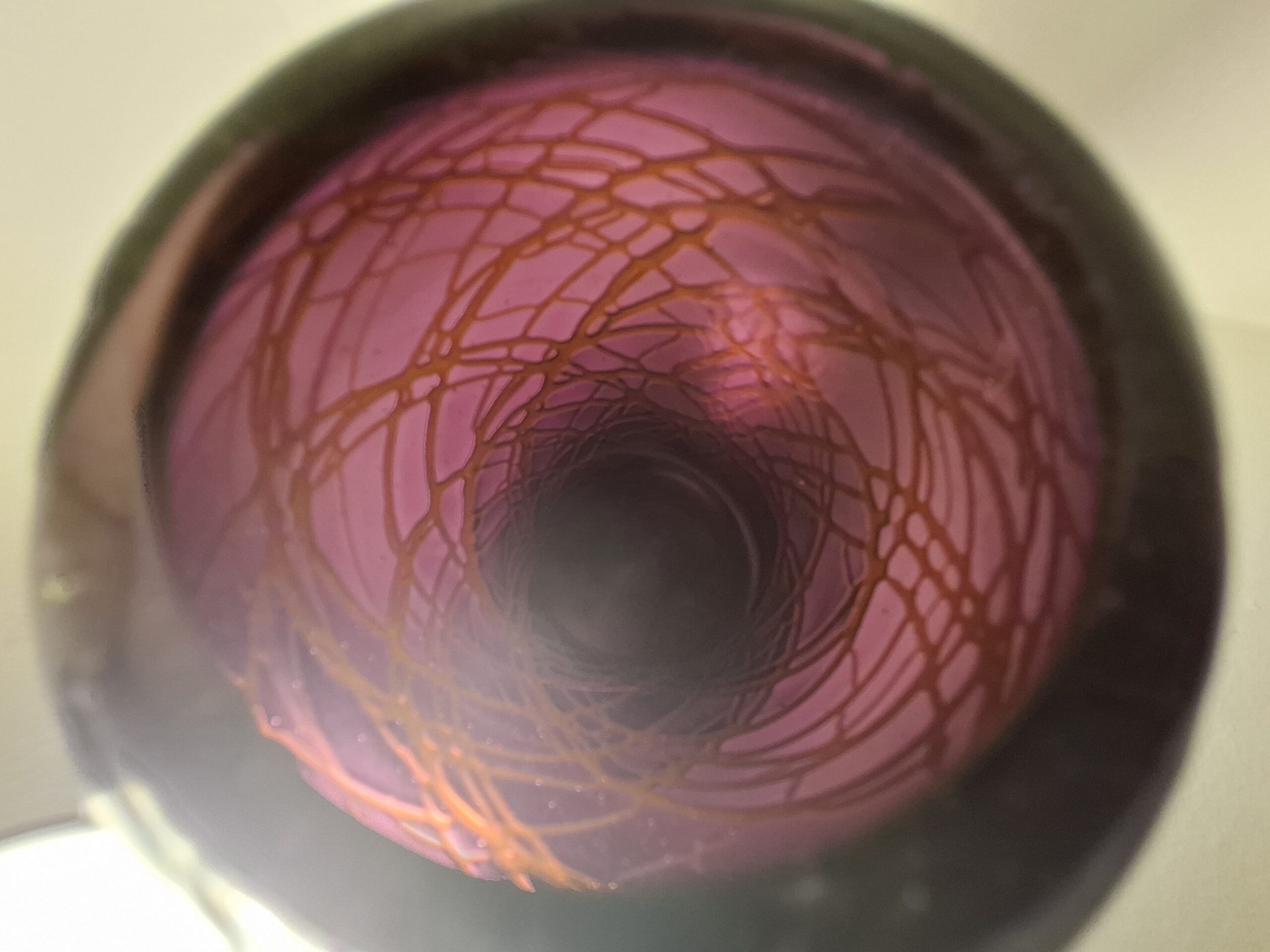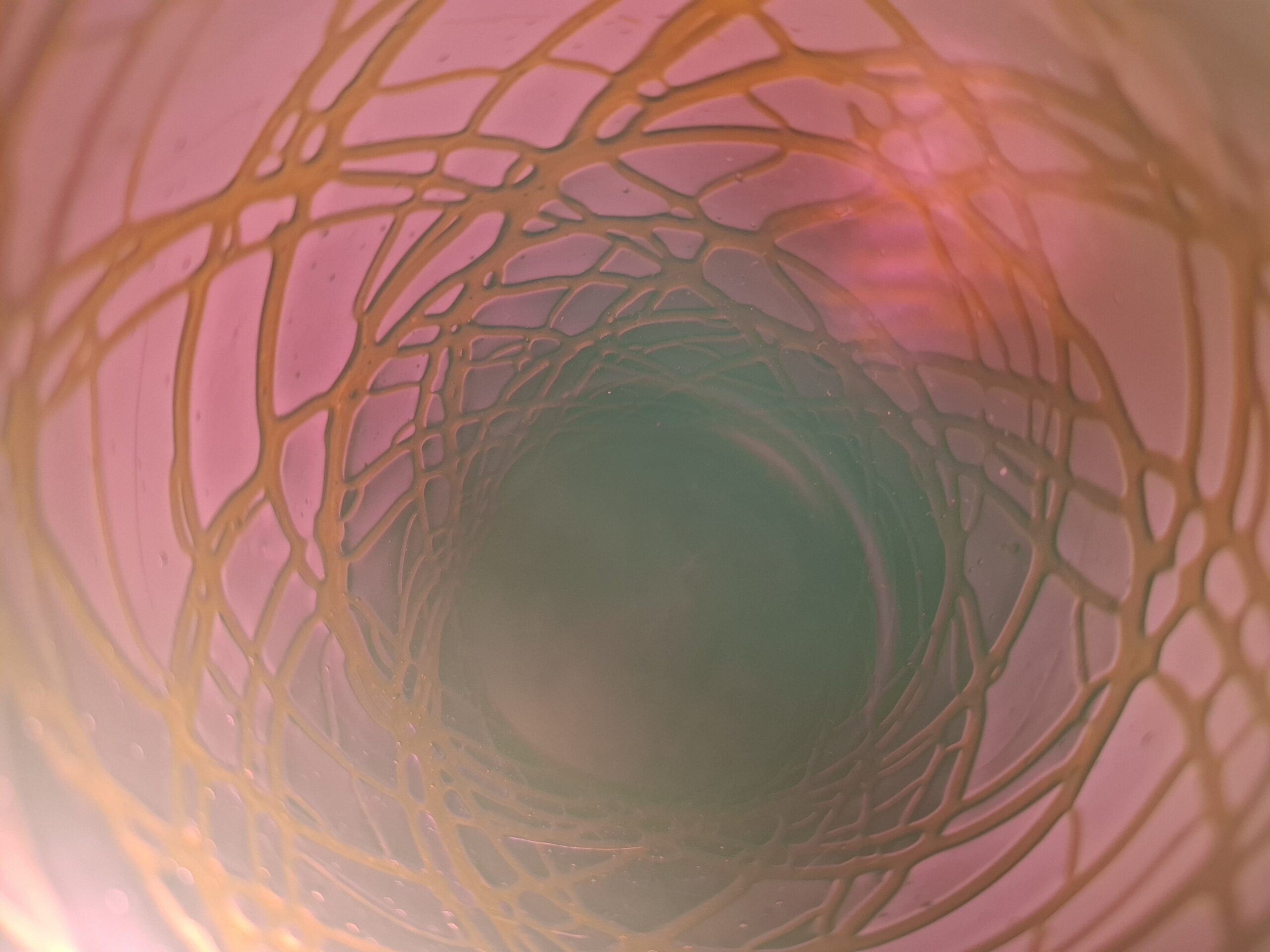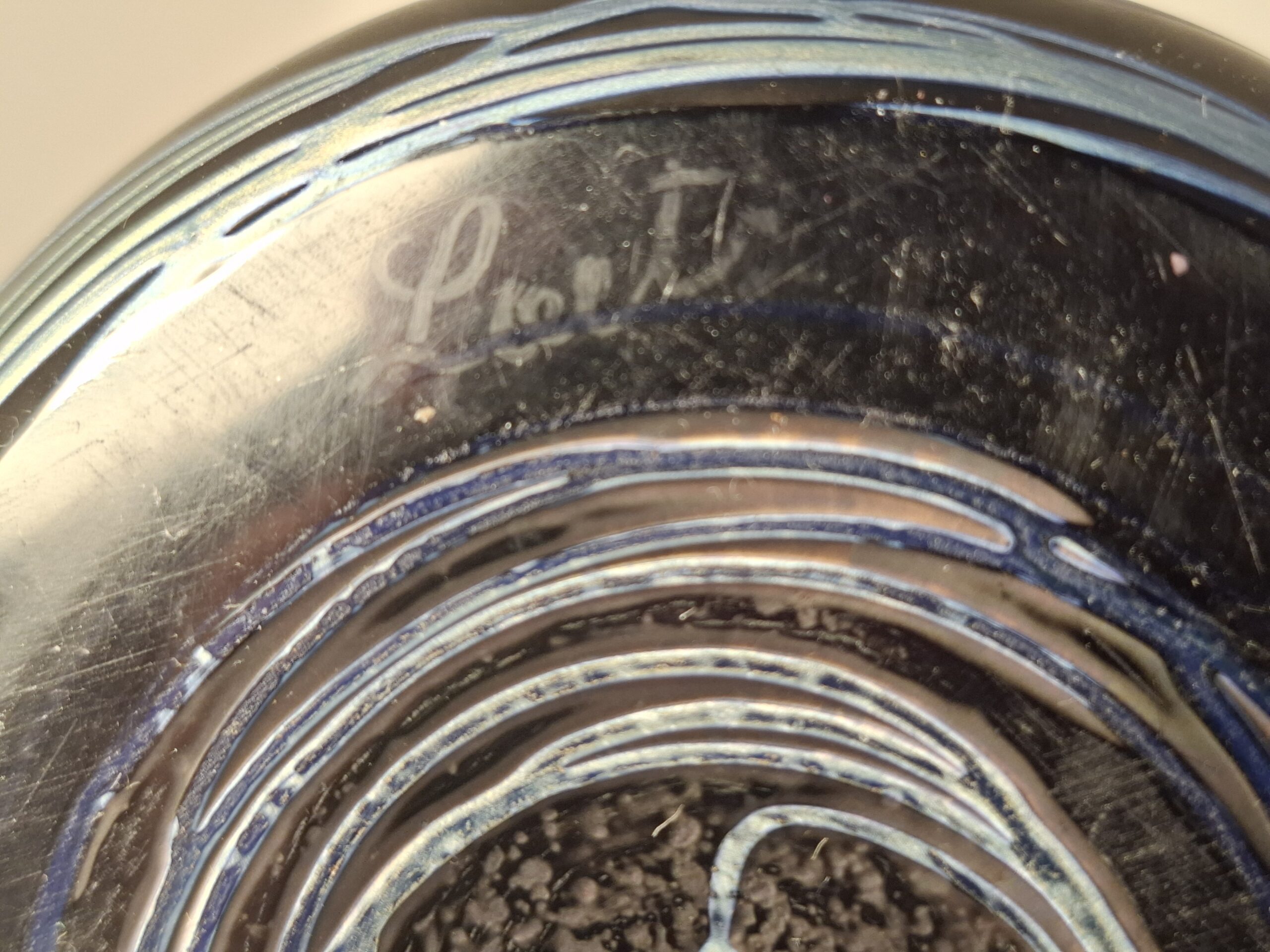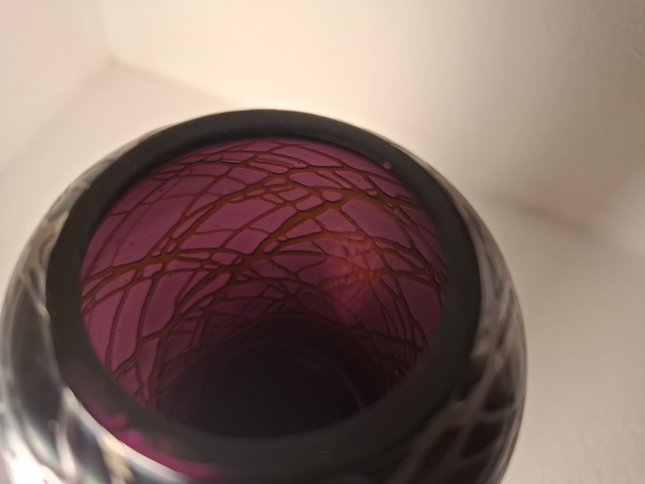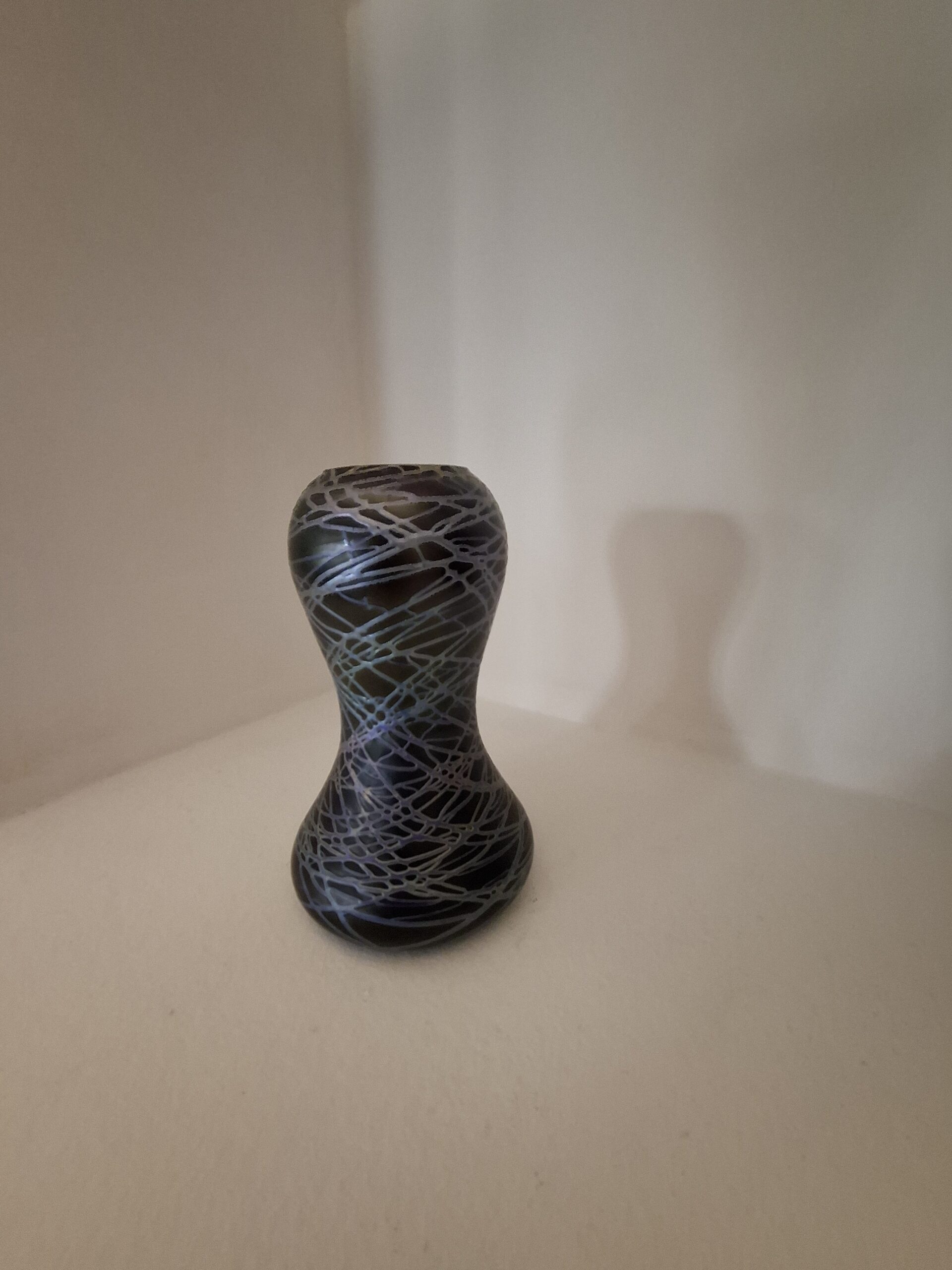 Opalizujący wazon austro-wegierskiego producenta Loetz, wzbogacony cieniowanymi, niebieskawymi liniami. Prawdopodobnie pochodzi z końca XIX w. Wysokość 15 cm, szerokość max 10 cm. U podstawy sygnatura Loetz.