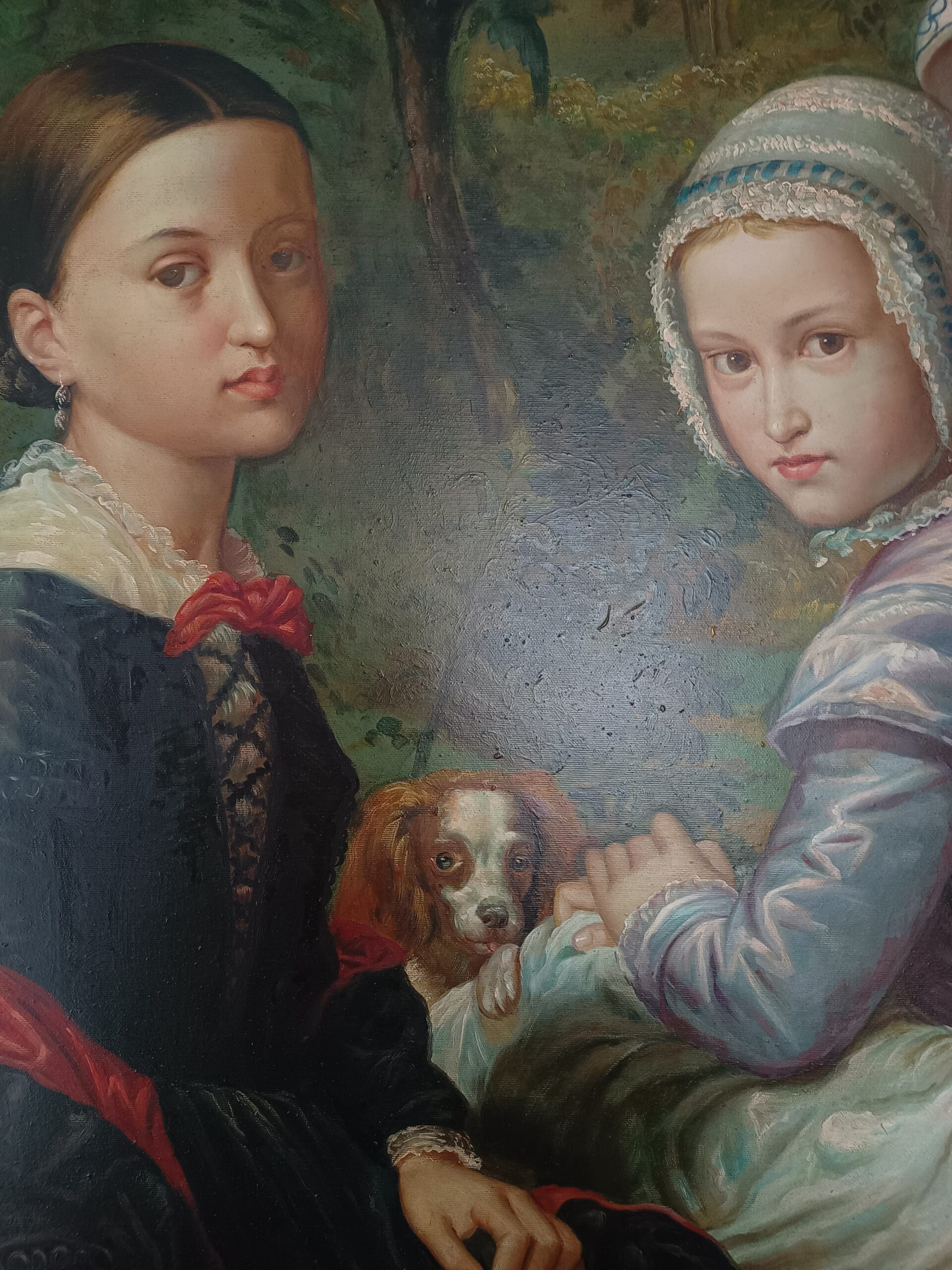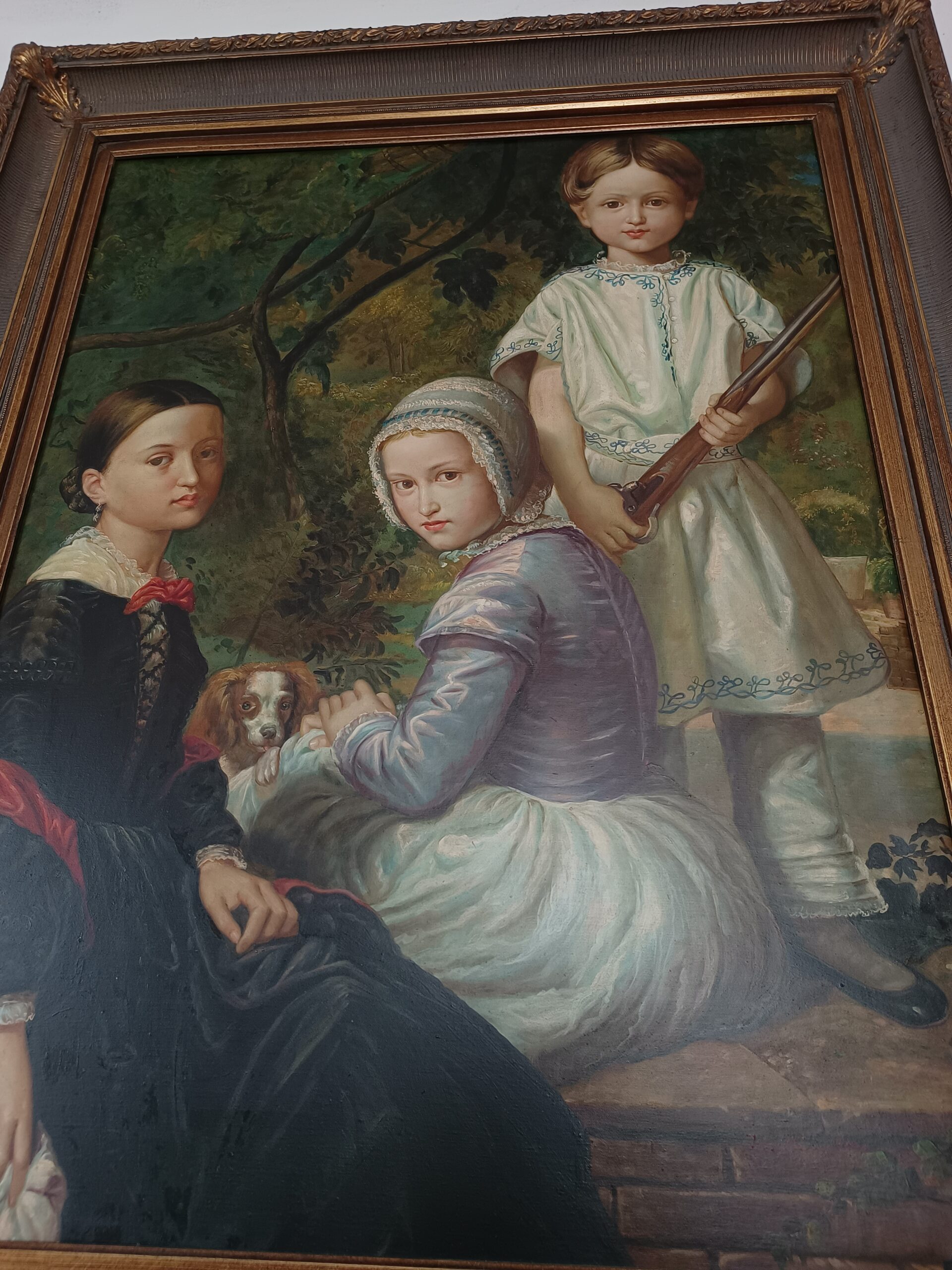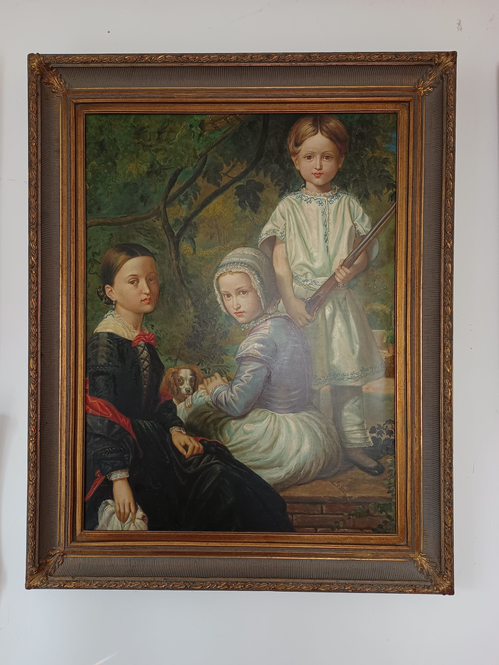 Oferowany obraz jest delikatnie uboższą wersją portretu Luisy, Rosy and Raimundo dzieci Raimundo de Madrazo y Garreta ur. 24 czerwca 1841 w Rzymie, zm. 15 września 1920 w Wersalu. Oryginalny obraz tego hiszpańskiego malarza znajduje się w kolekcji hiszpańskiego rodu malarzy Madrazo w Madrycie z numerem inwentarzowym 11. Niemniej kopia albo autoreplika wykonana została z wielkim kunsztem i delikatnością detali. Obraz o imponujących rozmiarach 125/100 przyciąga uwagę także piękną wchodząca ramą, pozwalającej uzyskać efekt głębi.