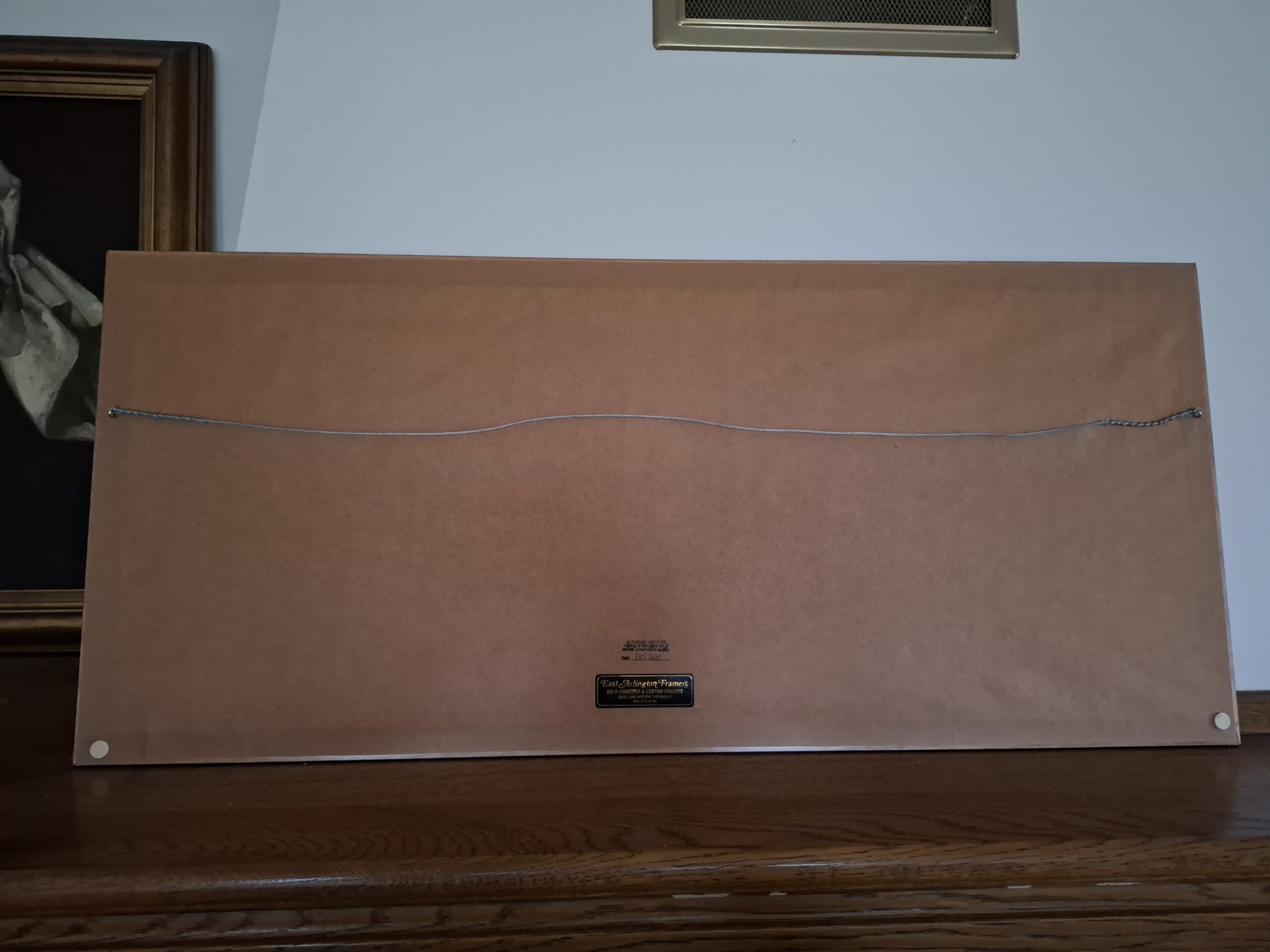 Wymiary oryginału szer. ok. 240 cm x 66 cm, natomiast wymiary oferowanej litografii z dedykacją autora to 87,5 cm x 38,5 [rama], 72x 22 cm [papier].
