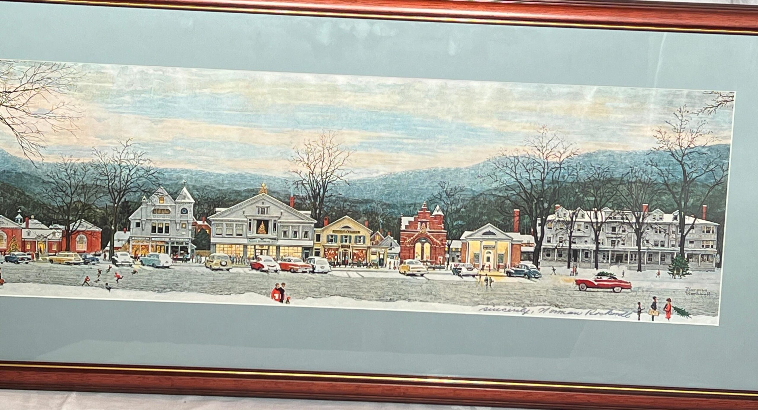 Podpisana osobiście przez Normana Rockwella litografia jego najpopularniejszego obrazu „Main Street w Stockbridge w czasie Świąt Bożego Narodzenia” z 1967 r. Podpis 'Sincerely, Norman Rockwell’ znajduje się w prawym dolnym rogu / na brzegu obrazu. Praca oprawiona profesjonalnie, w perfekcyjnym stanie, pochodzi z kolekcji Gregga i Woody Swain, USA.