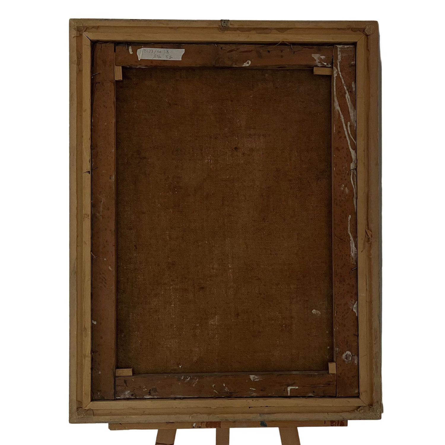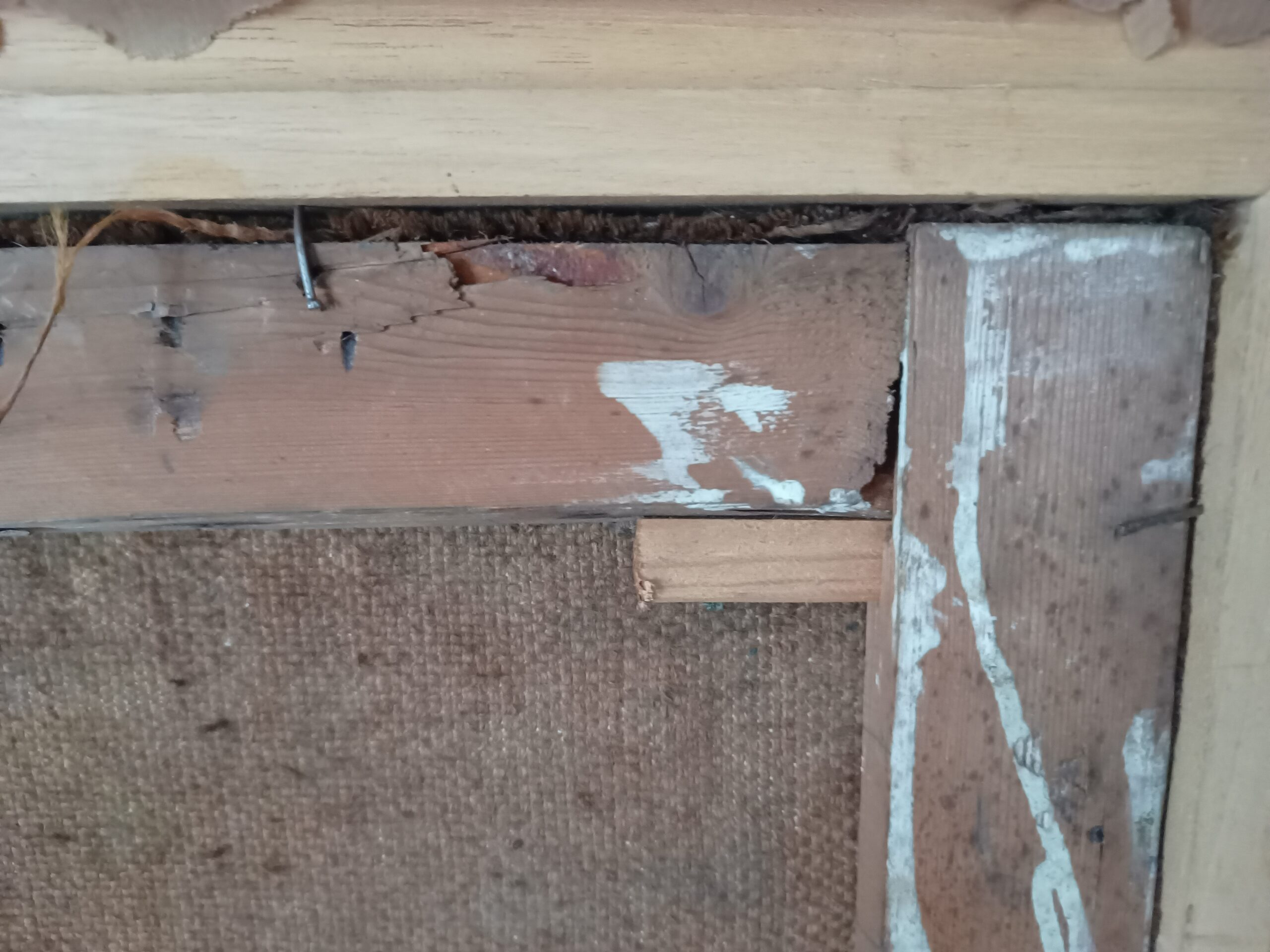 Obraz malowany na grubo tkanym płótnie w solidnej ramie. Płótno ma niewielkie uszkodzenia na gorze dwie dziurki prawdopodobnie po poprzednim montowaniu i przetarcie płótna przy bucie.