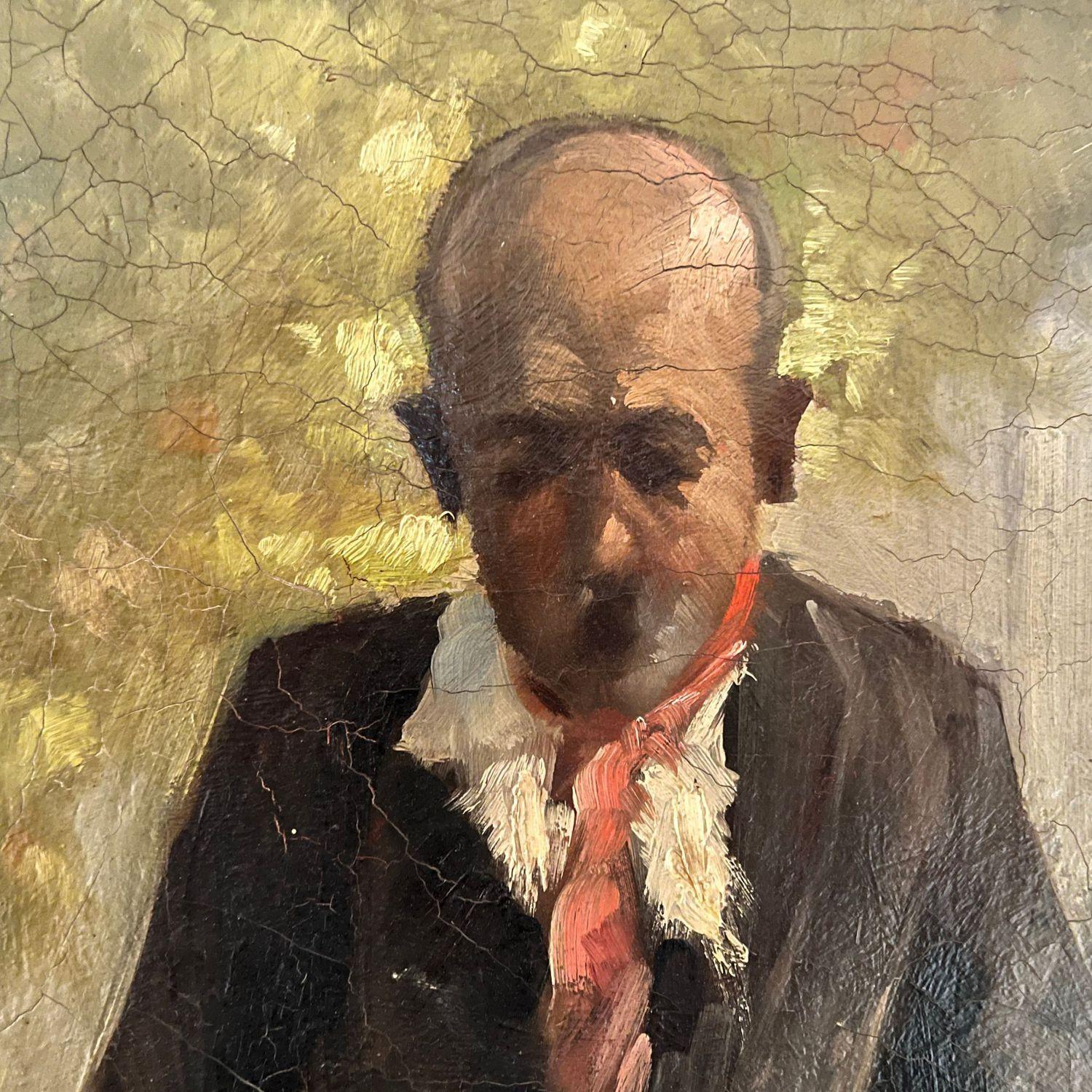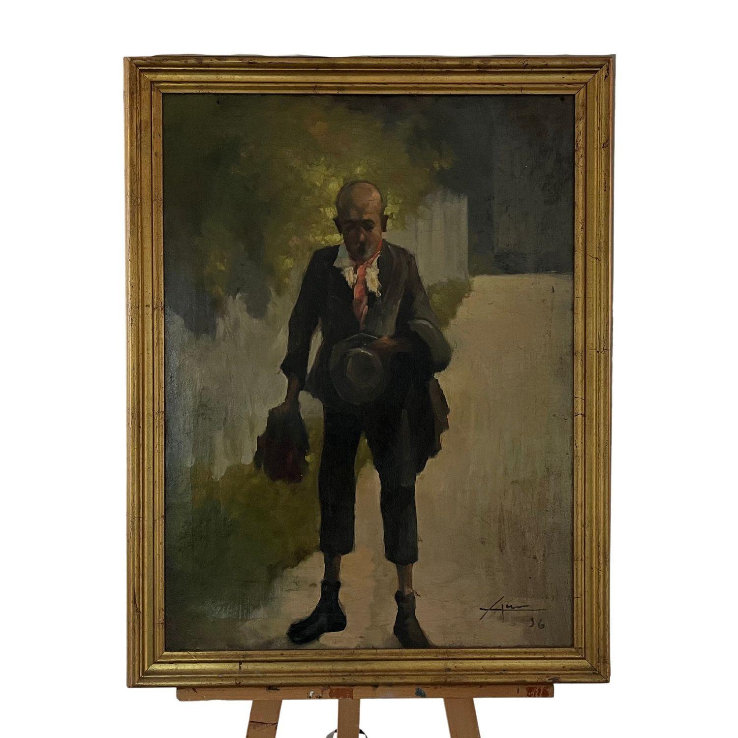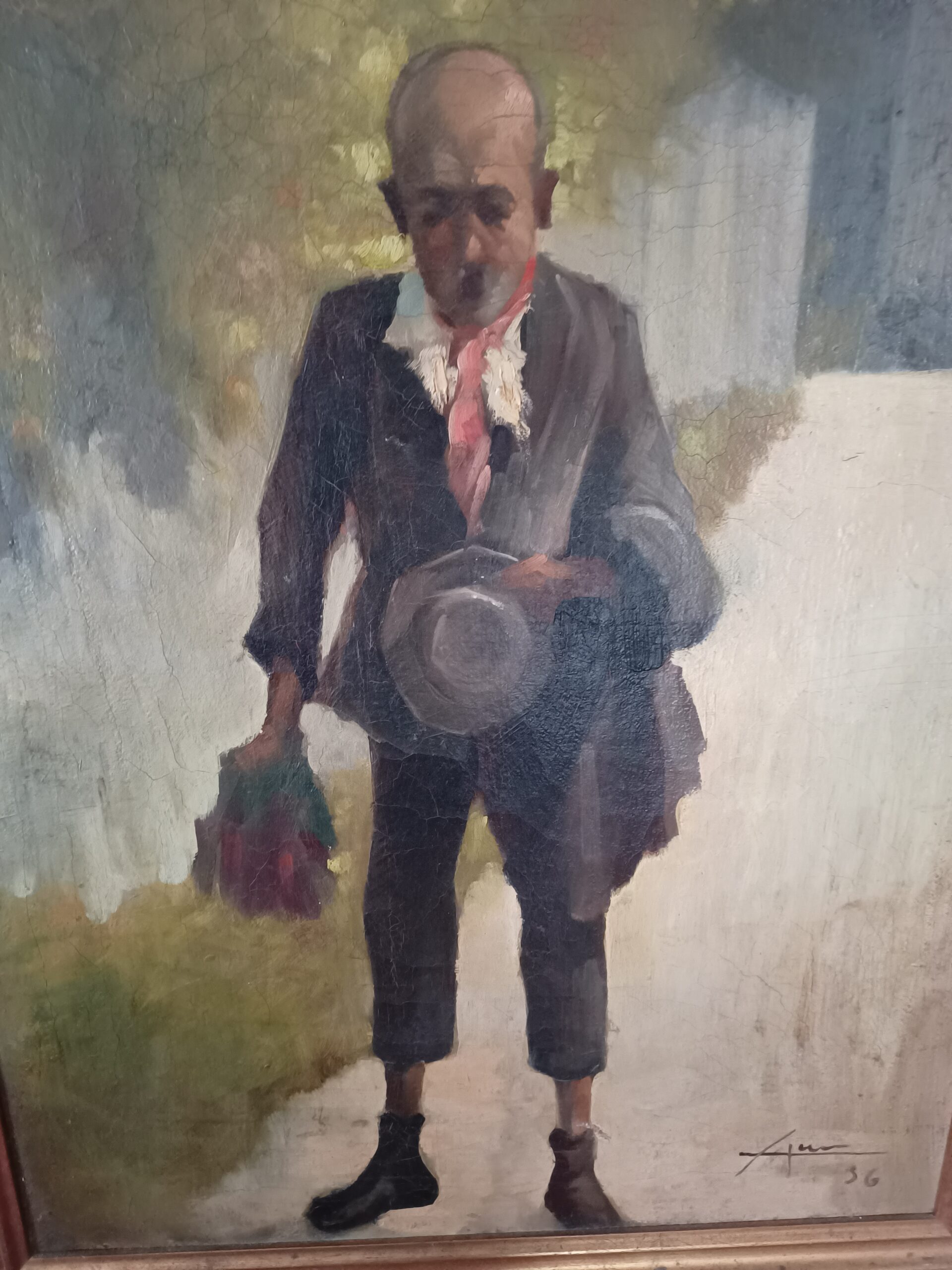 Sygnatura nieustalonego artysty . Obraz bardzo nostalgiczny, przedstawia smutnego mężczyznę z bukietem kwiatów