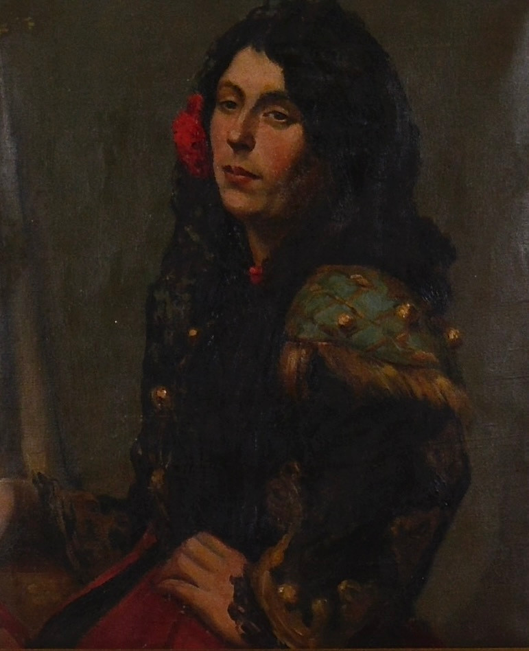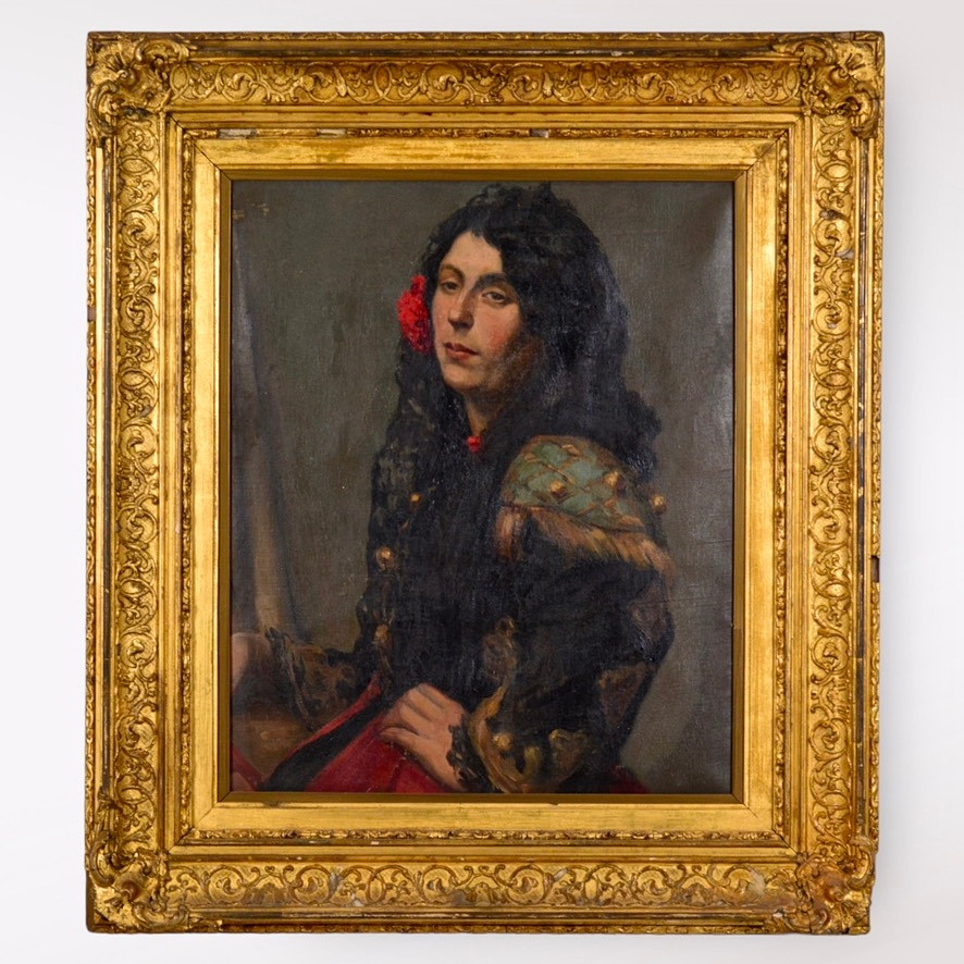 Obraz olejny na płótnie, „Hiszpanka”, wym. 58×48 cm [rama], malarz nieznany, sygnatura z tyłu „Wilkie” [Dawid Wilkie?]; wkrótce dostępny w sprzedaży