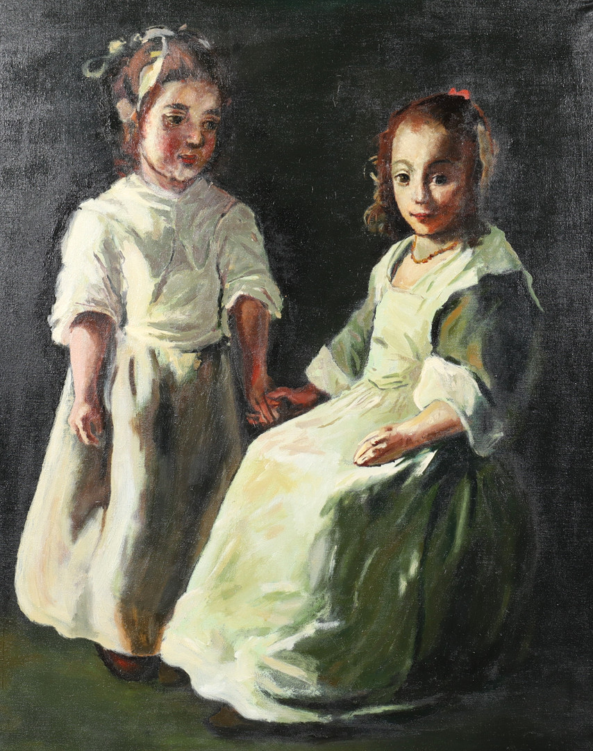 Bardzo duży obraz olejny na płótnie przedstawiający dwie małe żydowskie dziewczynki w białych fartuszkach – prawdopodobnie siostrzyczki. Obraz podpisany na ramie Artur Markowicz, na odwrociu płótna inicjały A.M., niezidentyfikowane oznaczenia mogące być numeracją inwentaryzacyjną.