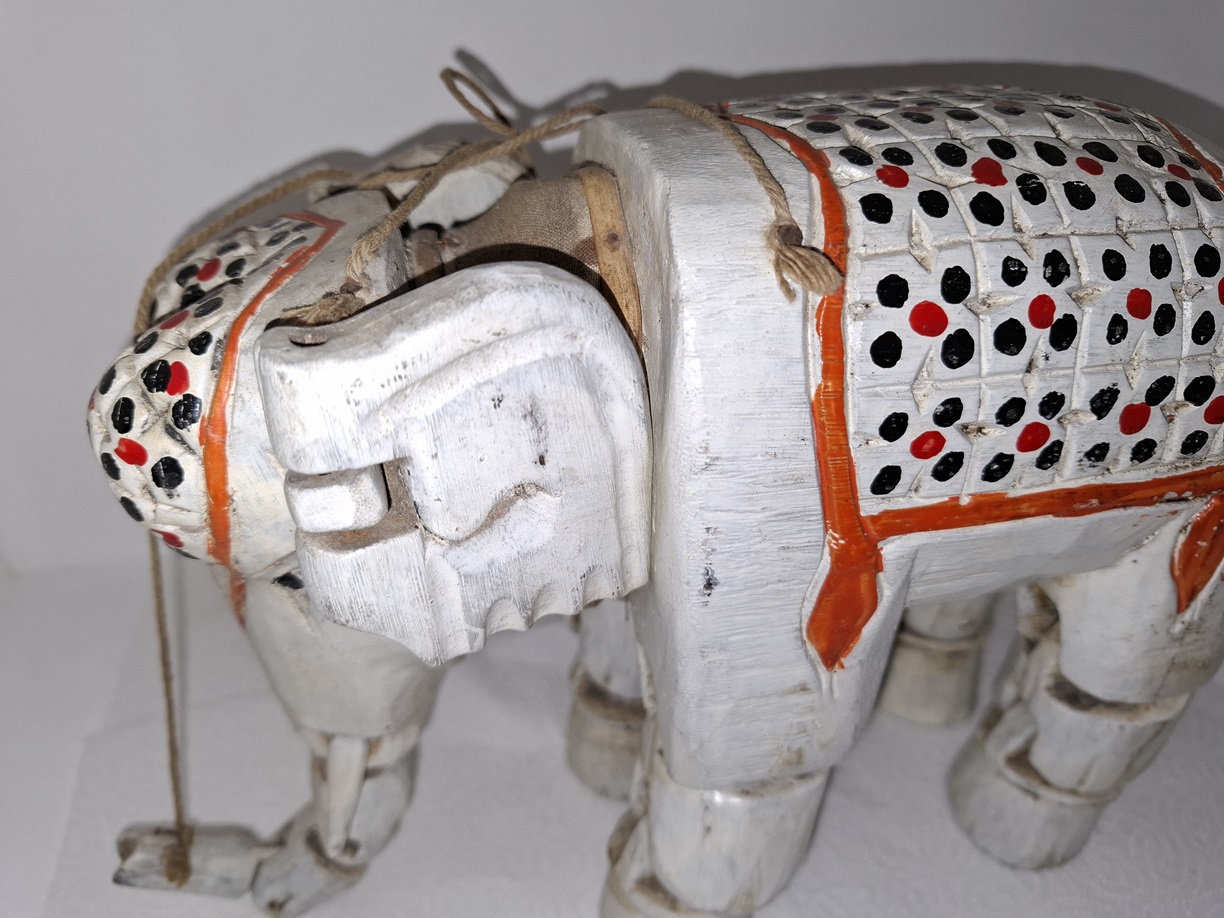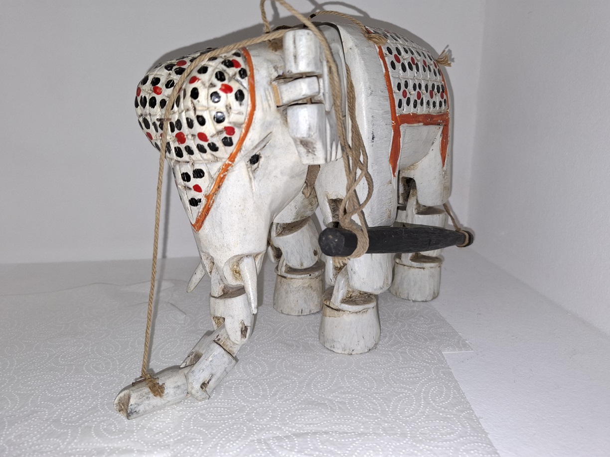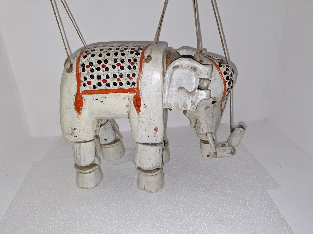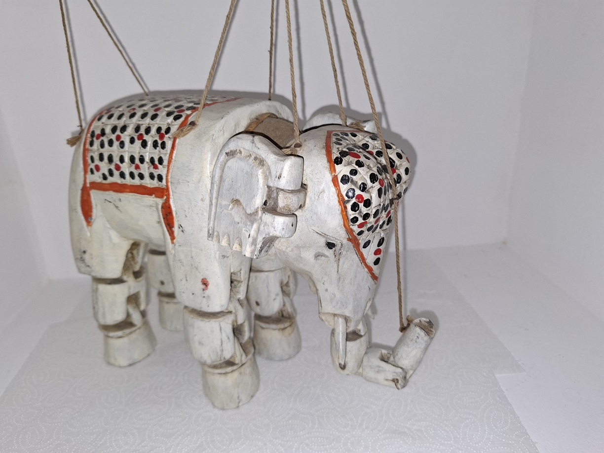 Ręcznie rzeźbiony słoń -marionetka, Indie Brytyjskie lata 30 XX w. – wkrótce dostępny w sprzedaży