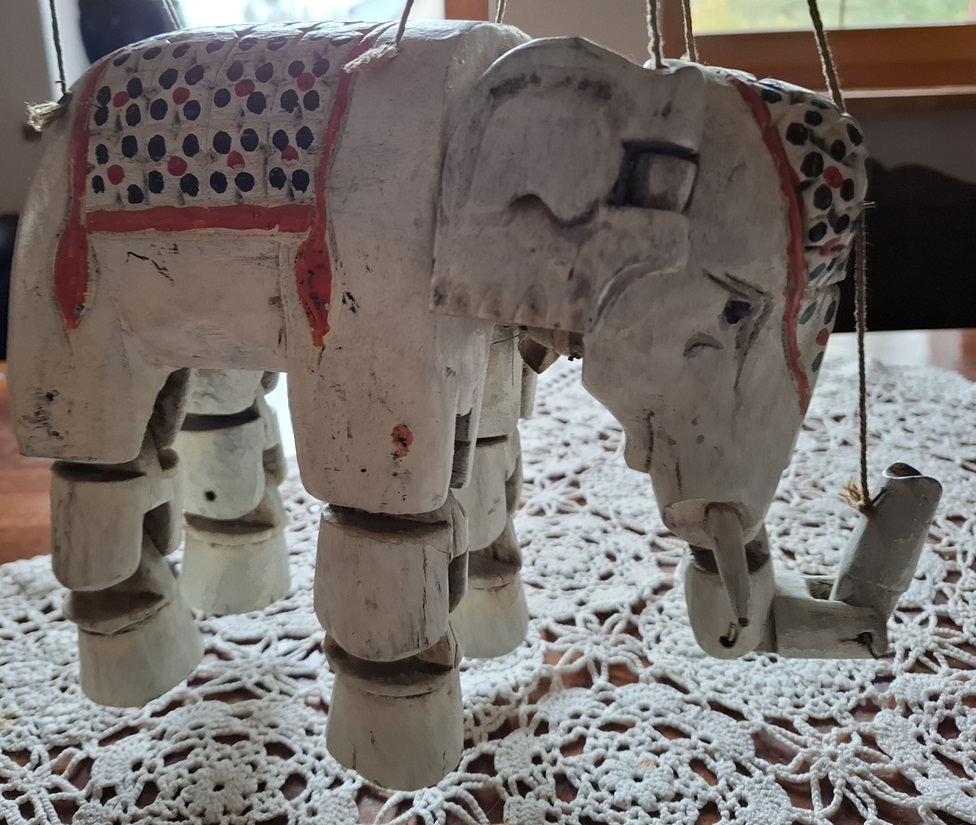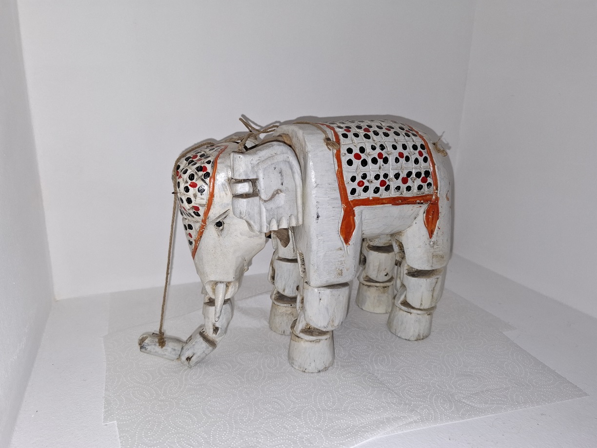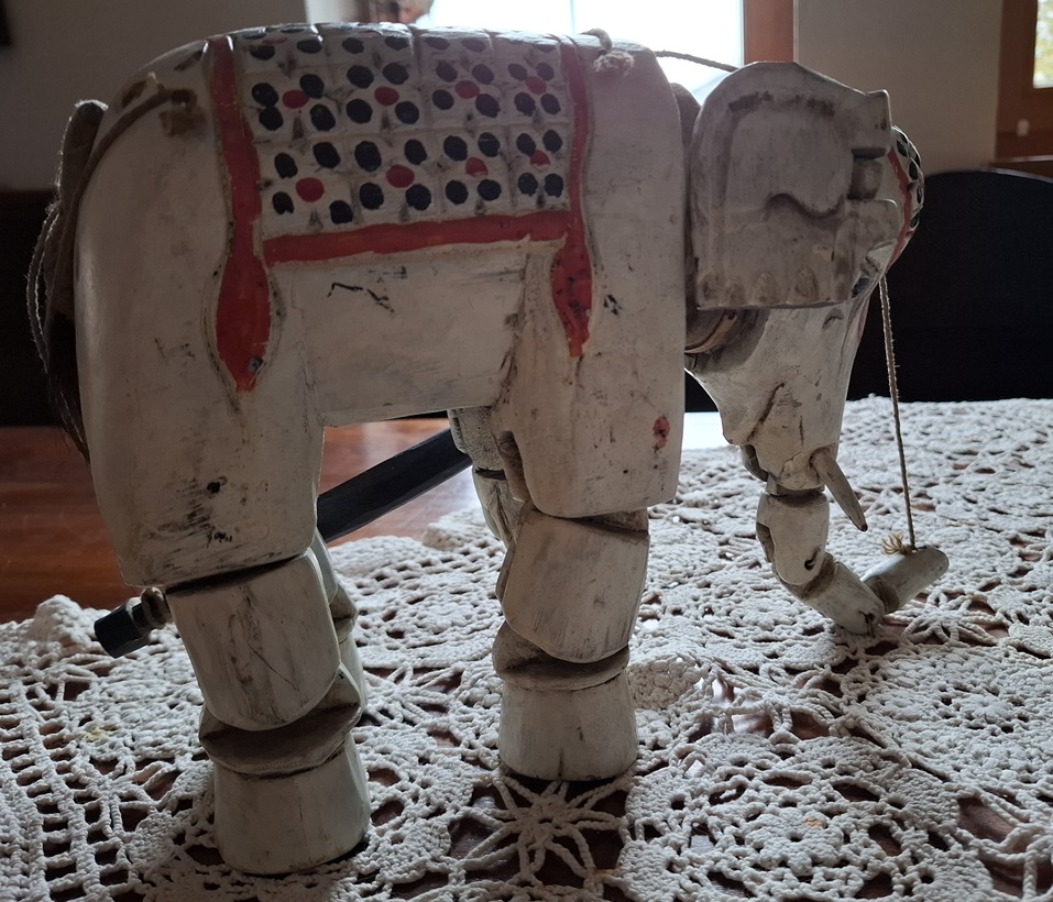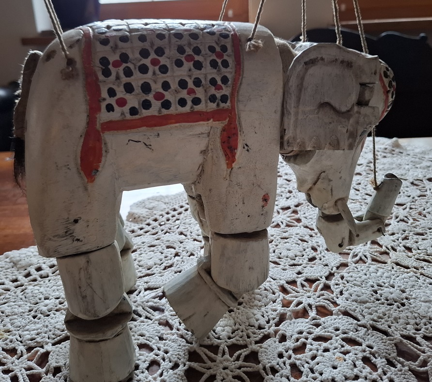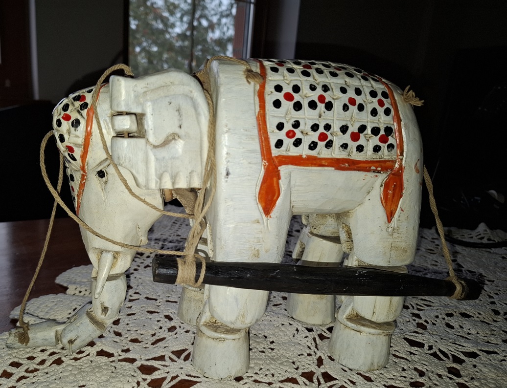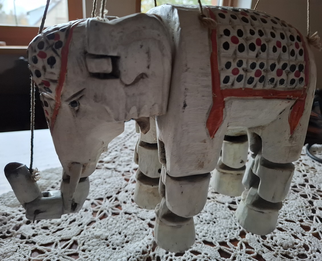 Ręcznie rzeźbiony słoń -marionetka, Indie Brytyjskie lata 30 XX w. – wkrótce dostępny w sprzedaży