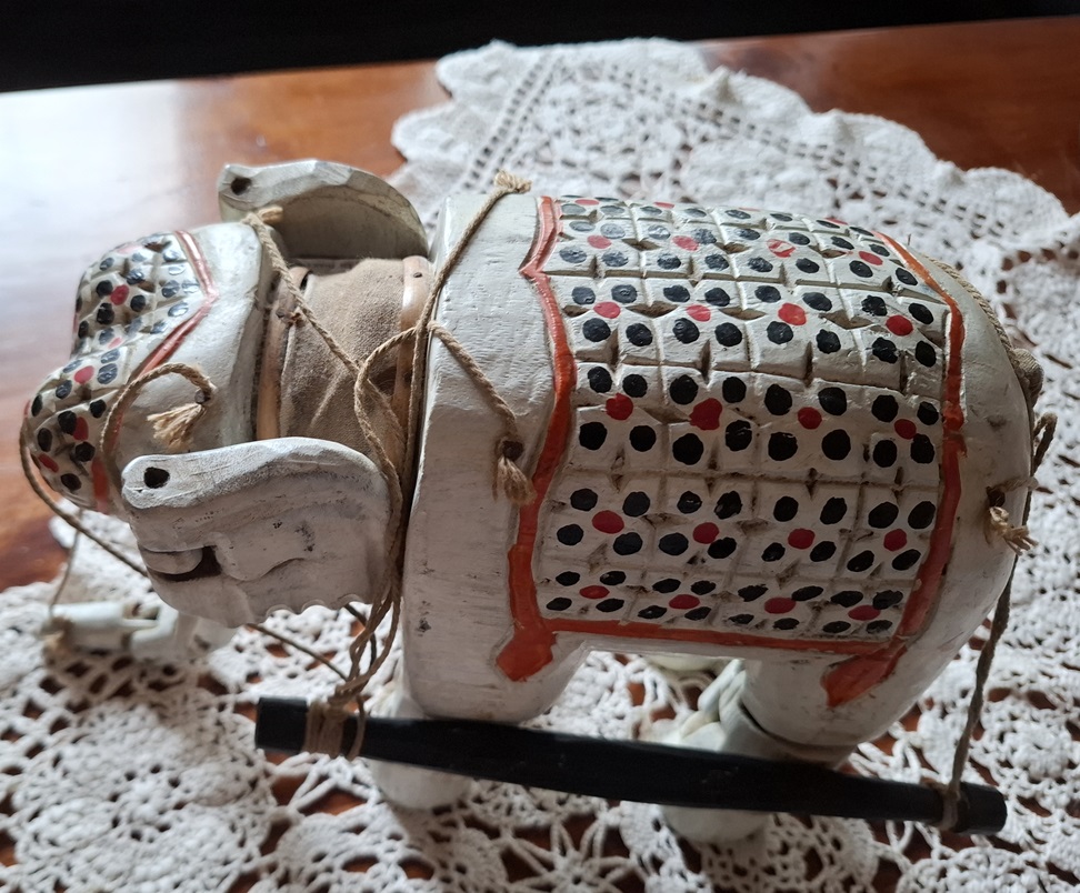 Ręcznie rzeźbiony i malowany słoń, pochodzący z Indii z czasów okupacji brytyjskiej (ang. British Raj 1858–1947)