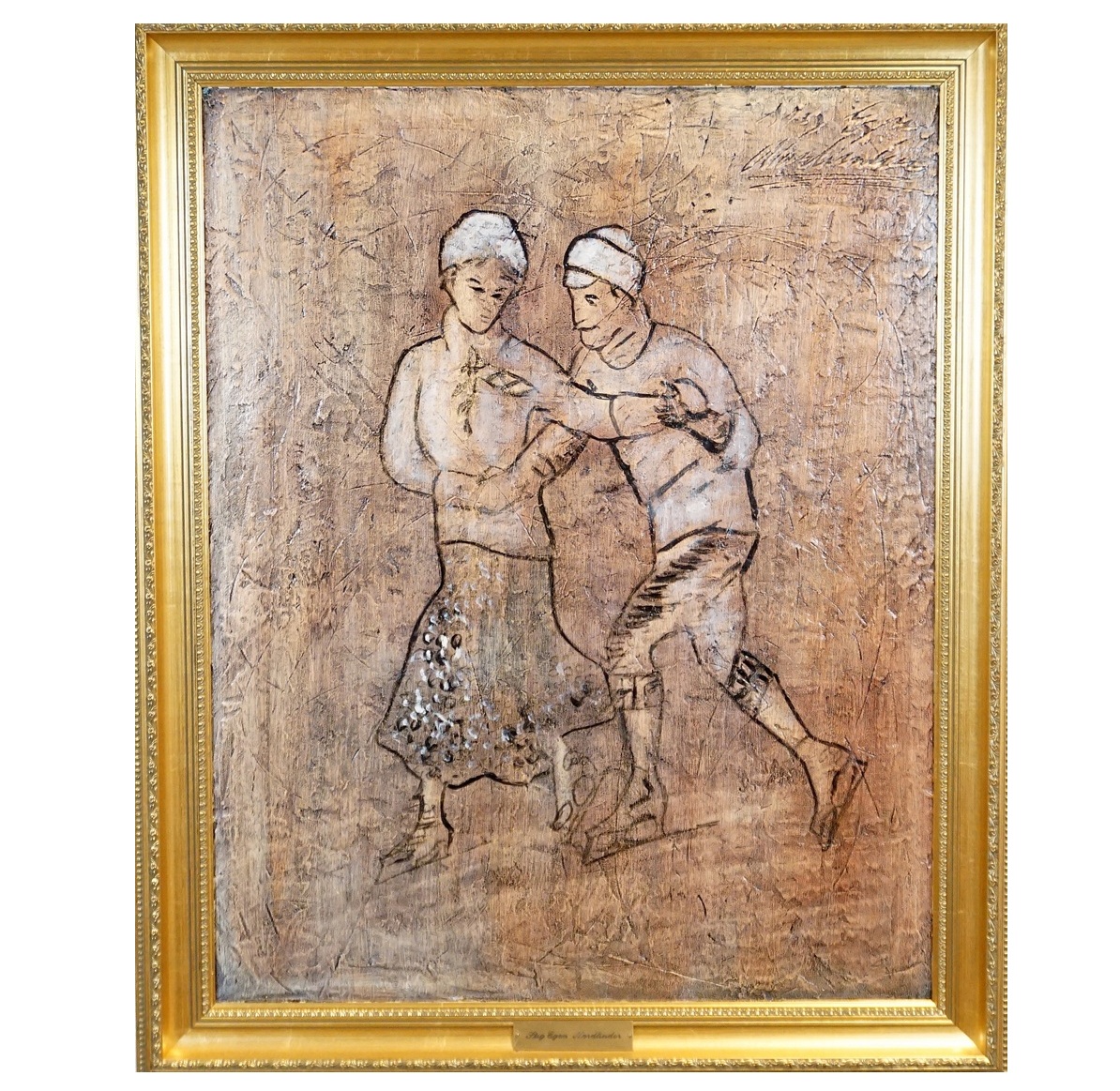 Oferowana praca to duży obraz olejny na płótnie, „Łyżwiarze figurowi” 107 x 98 cm [rama]
