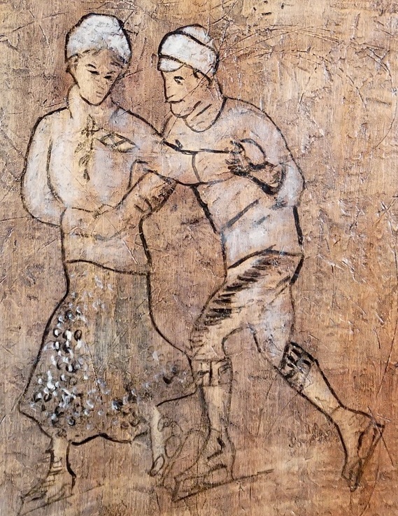 Stig Egon Nordlinder, duży obraz olejny na płótnie, „Łyżwiarze figurowi” 107 x 98 cm [rama]; sygn. p./g. – – wkrótce dostępny w sprzedaży