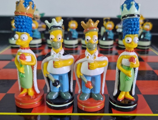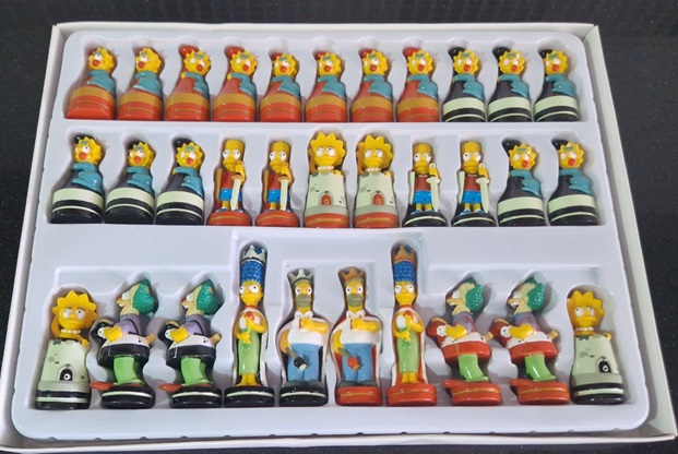 Wspaniałe, retro szachy „The Simpsons”, kultowego amerykańskiego serialu animowanego. Zestaw składa się z dużej i kolorowej tekturowej planszy o wymiarach 43 x 35,5 cm oraz kompletnego zestawu 32 kolorowych i bardzo szczegółowych pionków o wymiarach od 6,5 do 11 cm, z głównymi bohaterami Simpsonów. Homer jest królem, Marge królową planszy, Bart – biskupem, klaun Crusty – koniem, Lisa – wieżą, a Maggie trzyma się pionków.