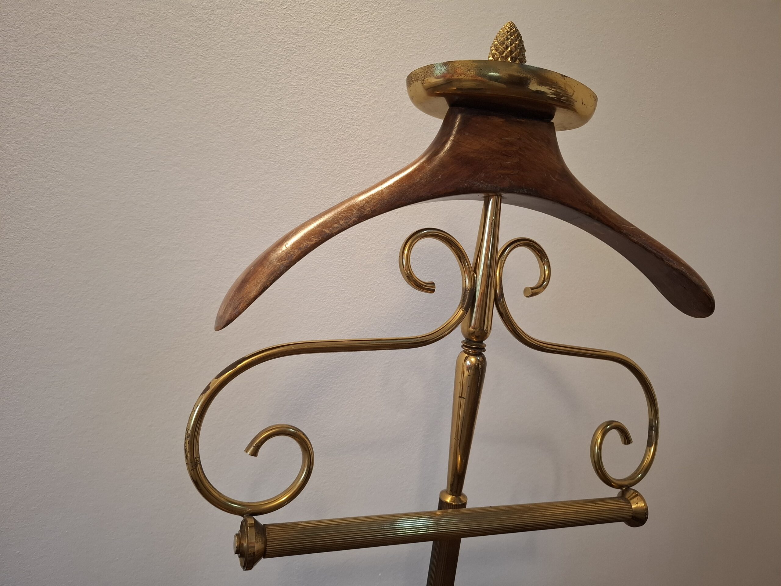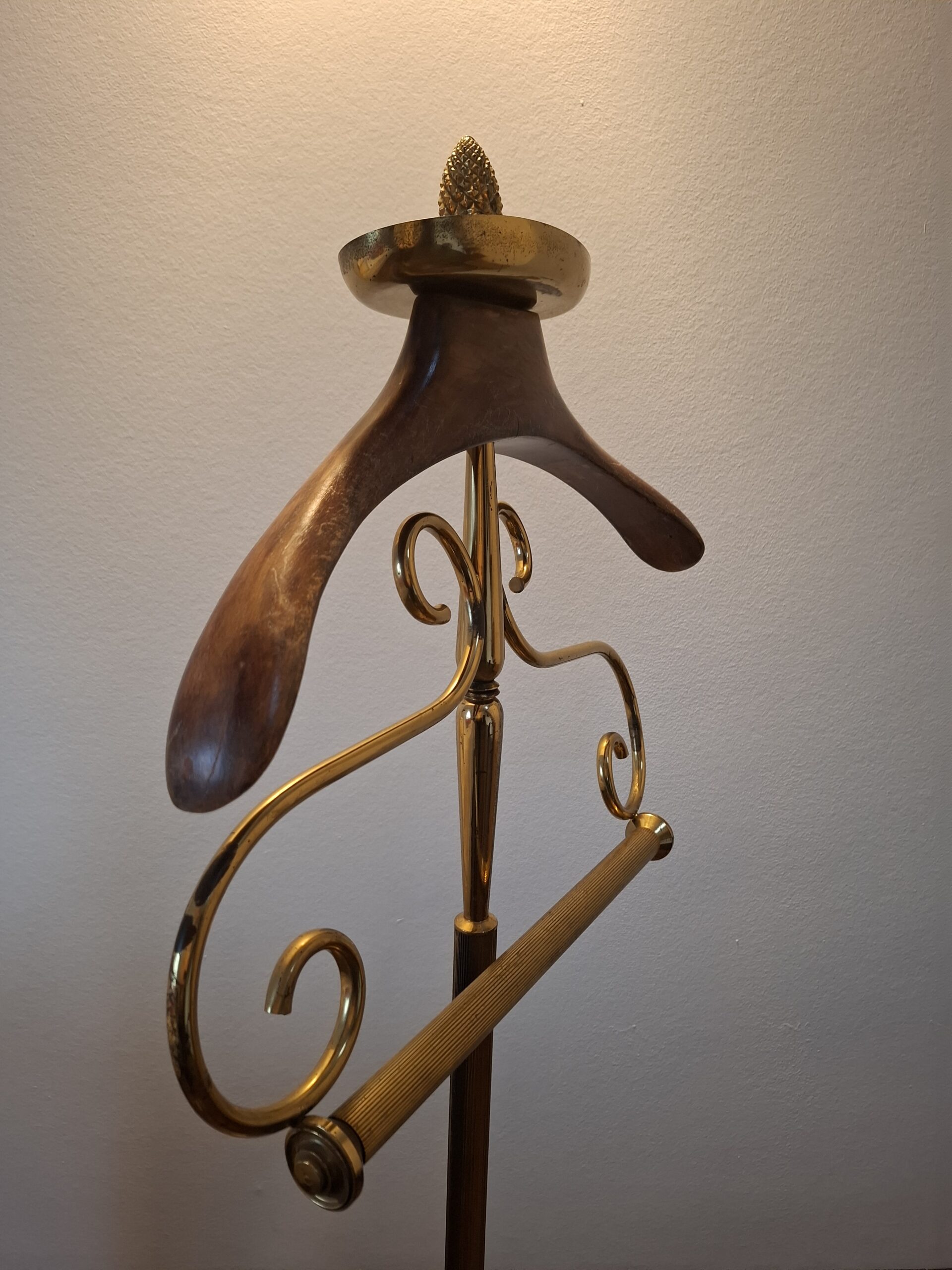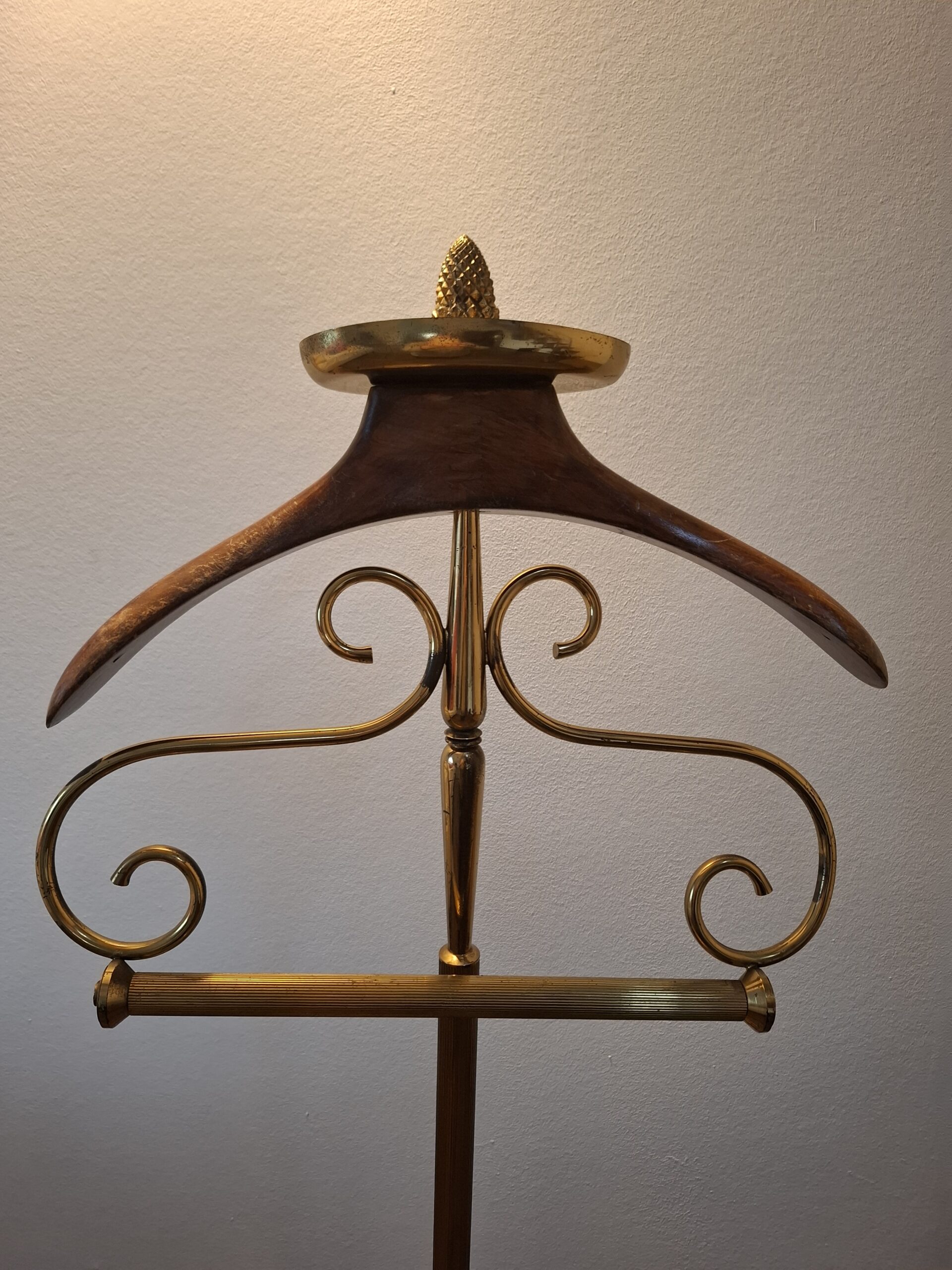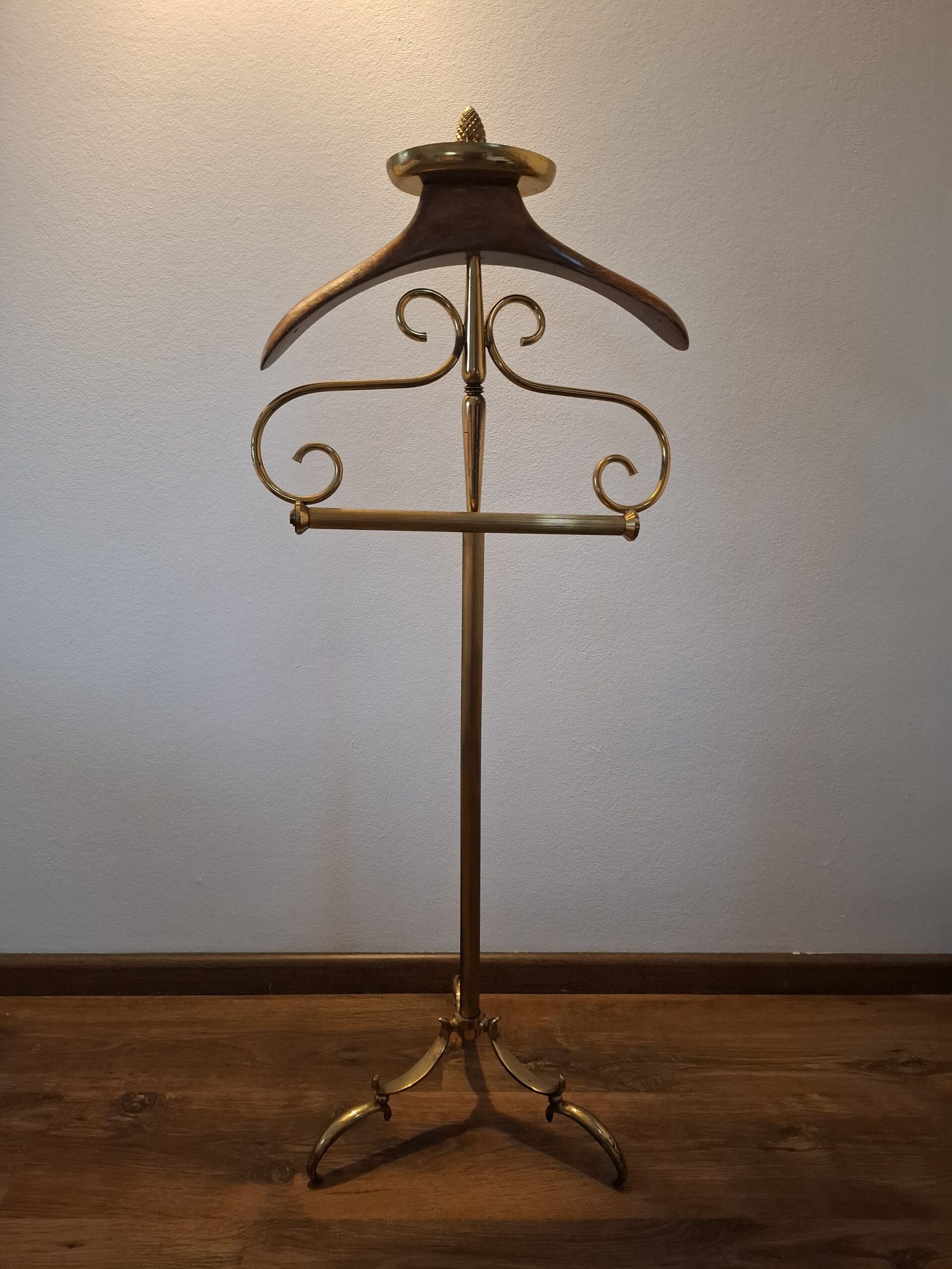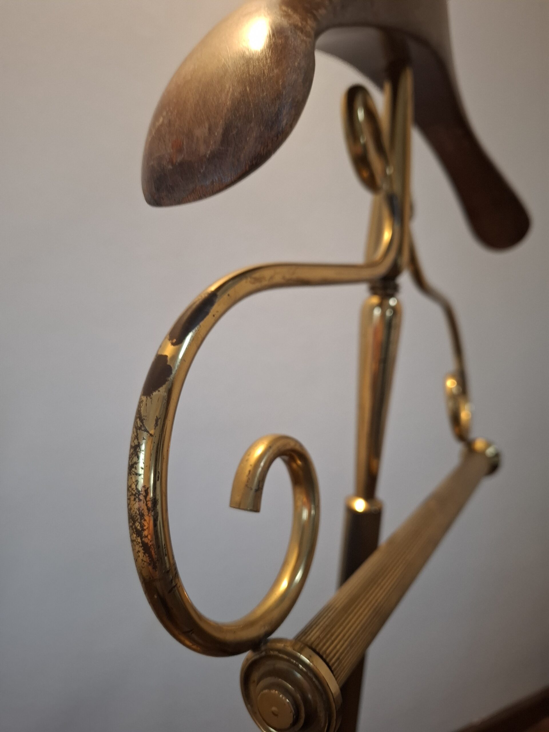 Wieszak kamerdyner, lokaj, tzw. valet stand, drewno mosiądz, semi antyk, lata 50-te XX w.