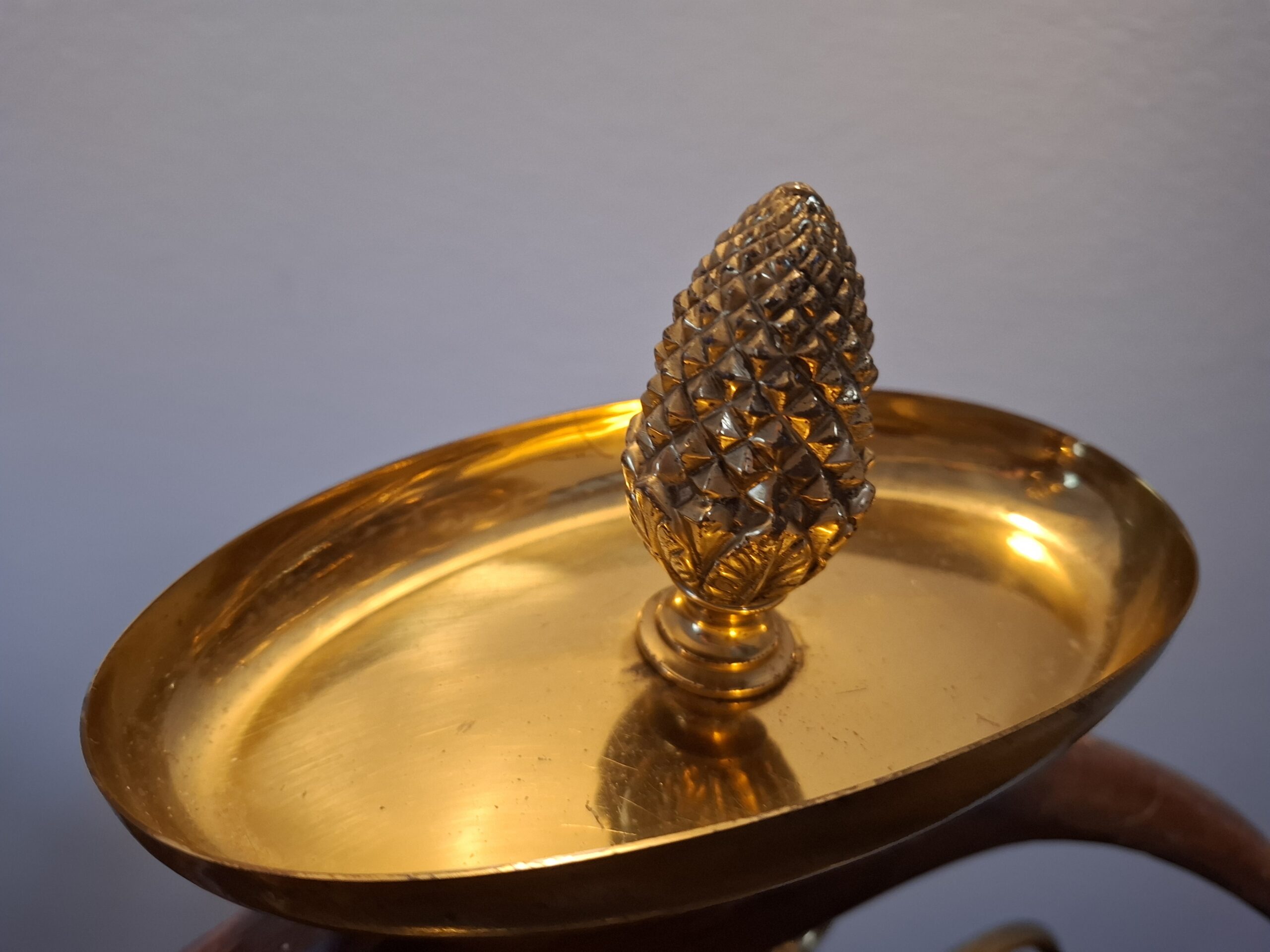Wieszak tzw. valet stand, lokaj, gentleman stand, wykonany z metalu i drewna, zwieńczony ozdobna gałką w kształcie ananasa. Posiada tackę na biżuterię. Wsparty na trzech ozdobnych nóżkach, ciężki i solidny. Posiada ślady zużycia właściwe dla wieku
