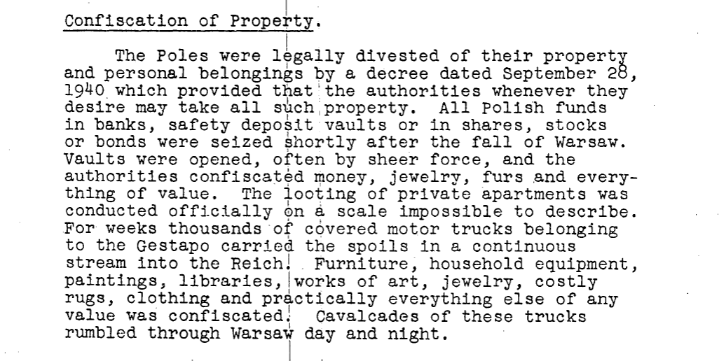 Pod okupacją niemiecką, dekretem z 28 września 1940 r., Polacy byli pozbawieni majątku i rzeczy osobistych. Odtajniony raport amerykańskiego wywiadu przywołuje, że po upadku Warszawy polskie fundusze w bankach, skarbcach depozytowych, akcje i obligacje zostały skonfiskowane. Sejfy bankowe otwierano siłą, skąd Niemcy kradli pieniądze, biżuterię, dzieła sztuki, słowem wszystko, co było wartościowe. Były też masowe rabunki prywatnych mieszkań, a ogromna skala tych grabieży nie jest możliwa do opisania tym bardziej udokumentowania. Przez tygodnie, miesiące i lata tysiące ciężarówek Gestapo w sposób ciągły wywoziły łupy do Rzeszy! Meble, sprzęt AGD, obrazy, biblioteki, dzieła sztuki, biżuteria, drogie dywaniki, ubrania i praktycznie wszystko co miało wartość zostało skonfiskowane. Kawalkady tych ciężarówek dzień i noc krążyły po Warszawie.